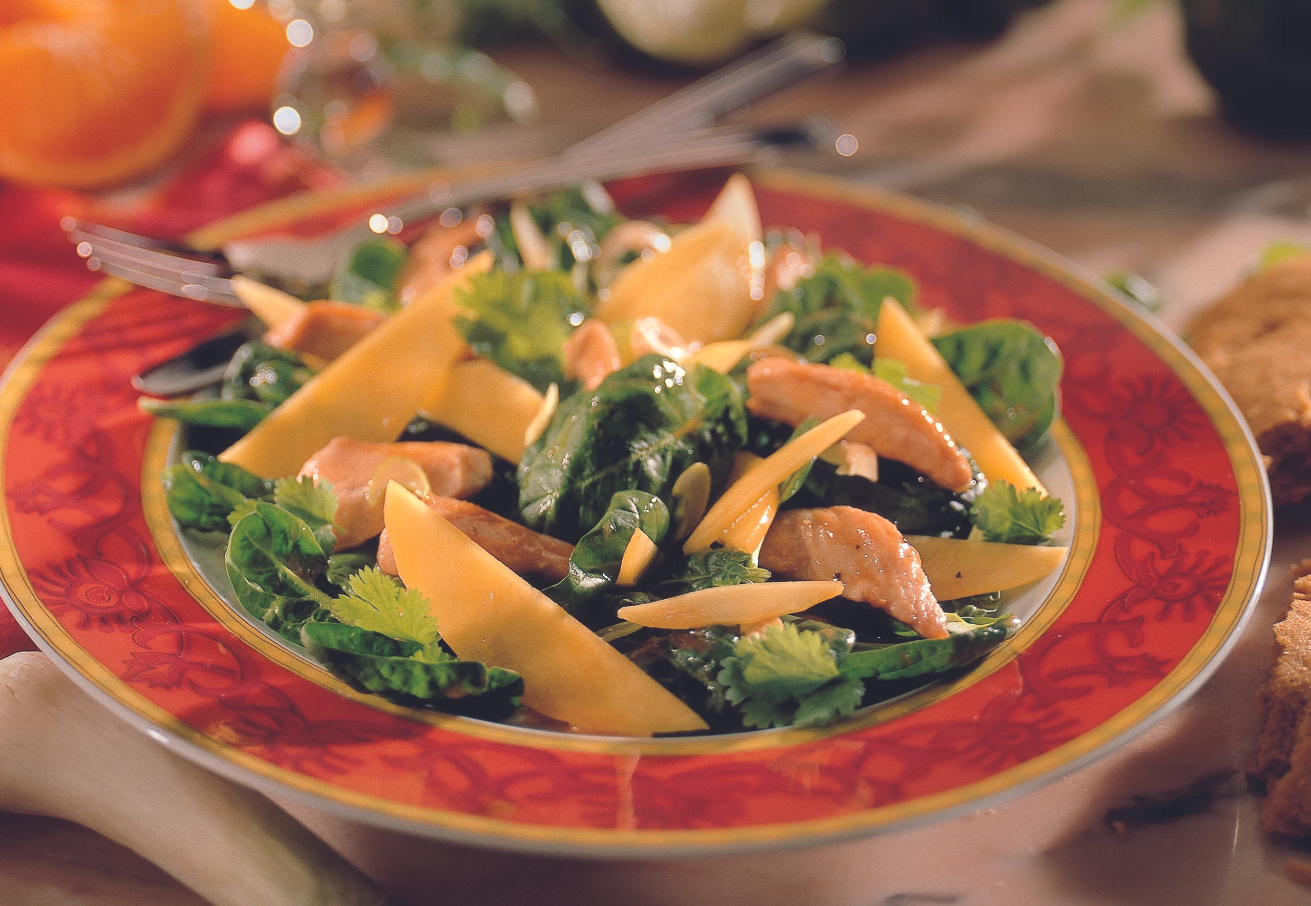 Saft zurück in die Pfanne gießen und auf ca. 6 EL einkochen. Saft mit Salz, Chili und 1 EL Limettensaft abschmecken und noch heiß mit den Spinatblättern vermischen. 5 Spinat und Hühnerstreifen portionsweise auf Tellern anrichten, mit Mangoscheiben und Jungzwiebeln garnieren, mit Koriander und Cashewnüssen bestreuen.