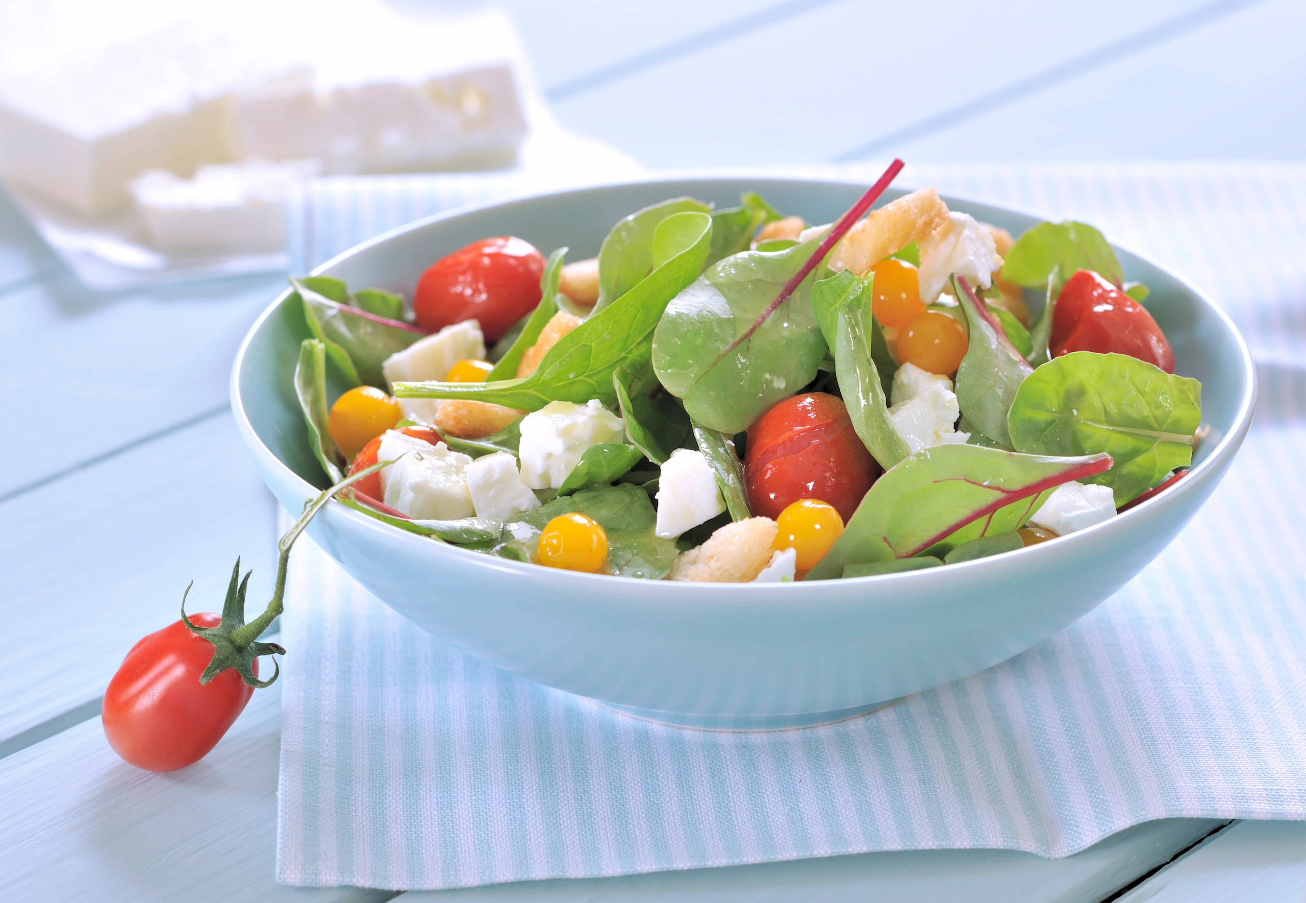 Spinat, Mangold und Paradeiser mit der Marinade vermischen. Salat in Schüsseln anrichten, mit Schafkäse und Brotstücken bestreut servieren.