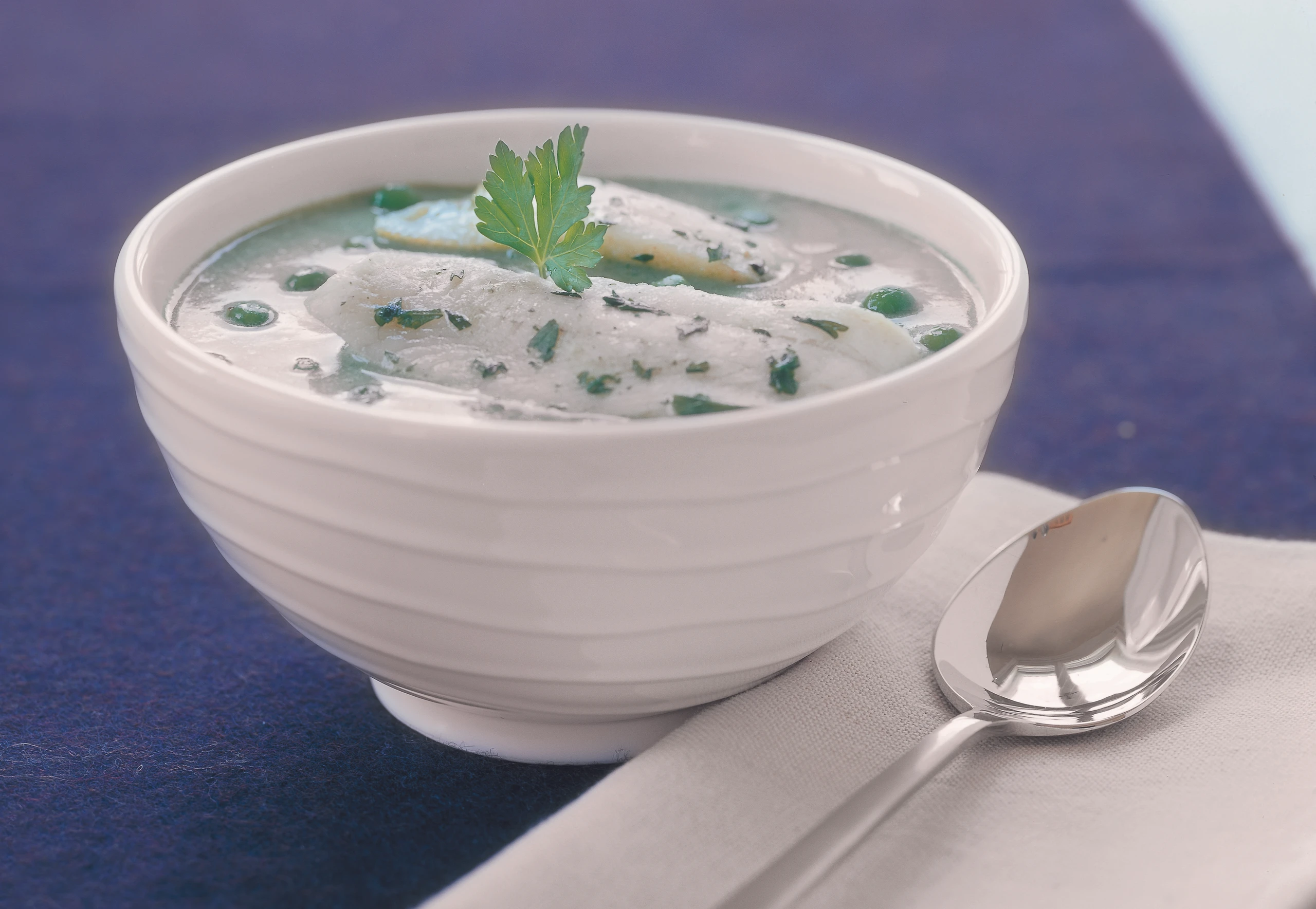 Milch zugießen und Spinat einrühren. Suppe mit Salz, Pfeffer und Muskat würzen, aufkochen und fein pürieren. Erbsen untermischen.
