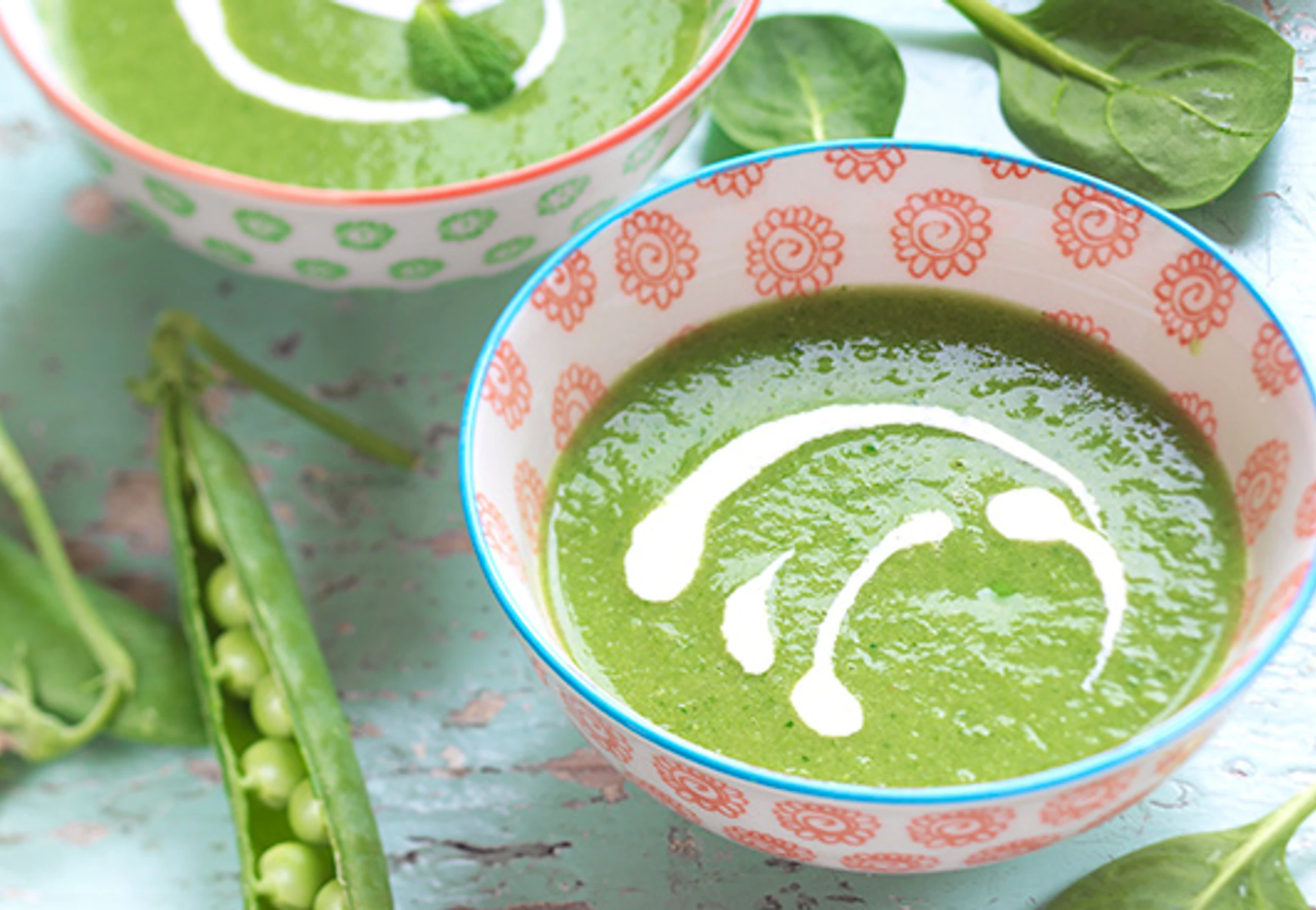 Spinatsuppe mit Erbsen, Jungzwiebeln und Minze