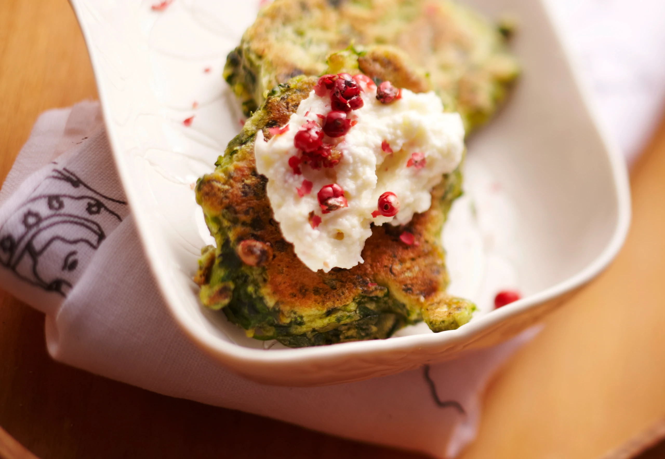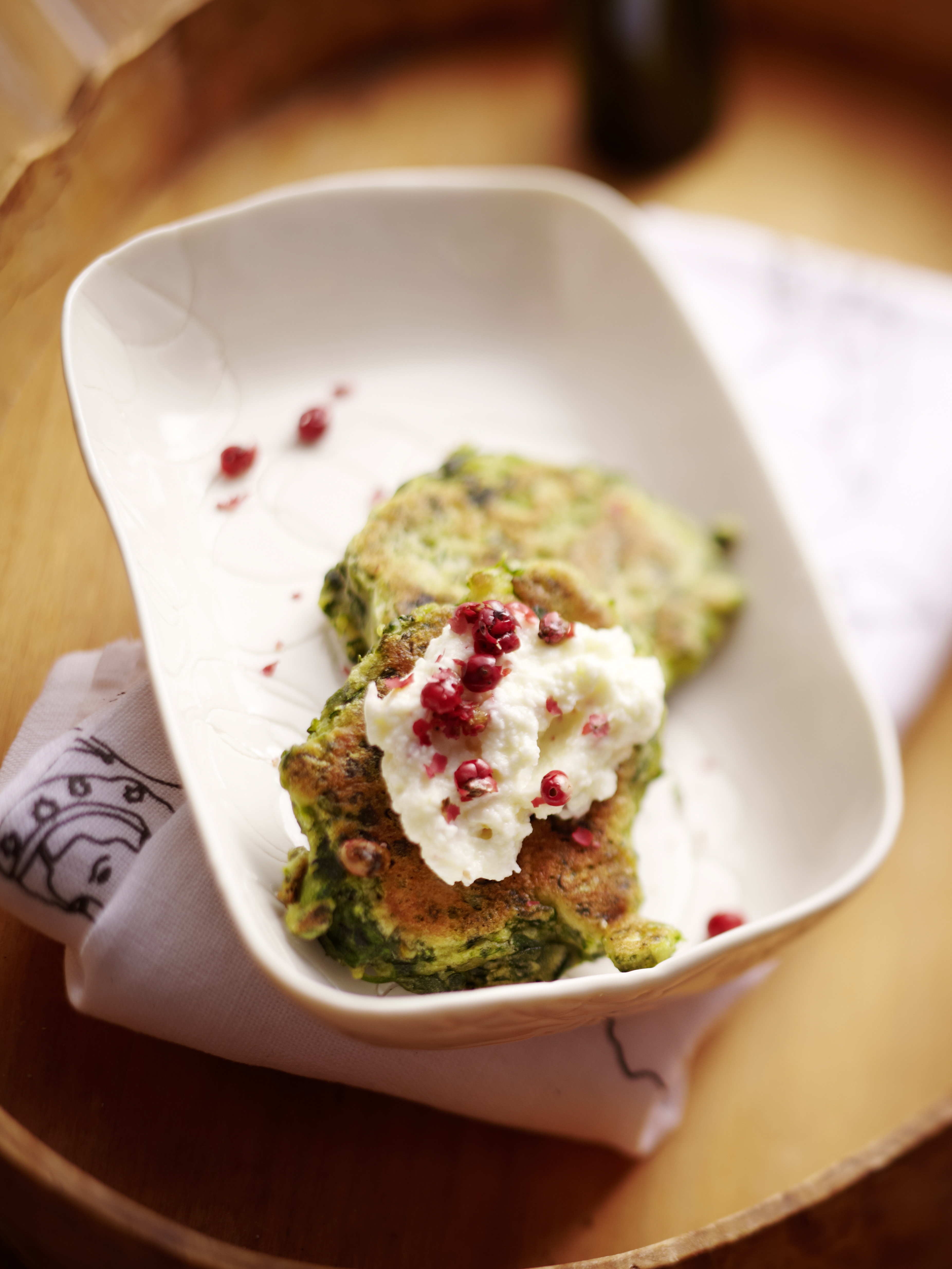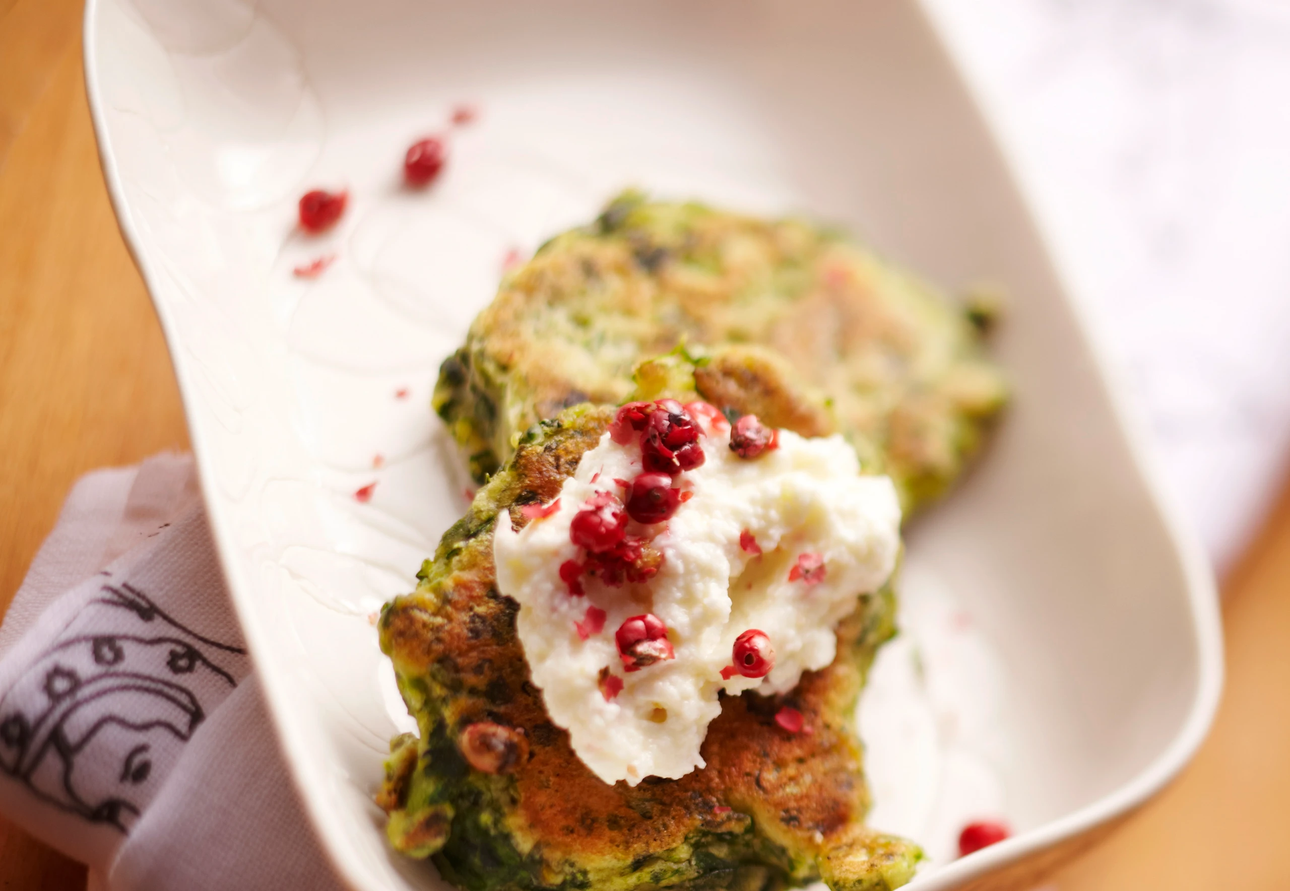 Ca. 30 Minuten vor dem Servieren die Taler mit dem Topping bestreichen und mit restlichen Rosa Beeren bestreuen.