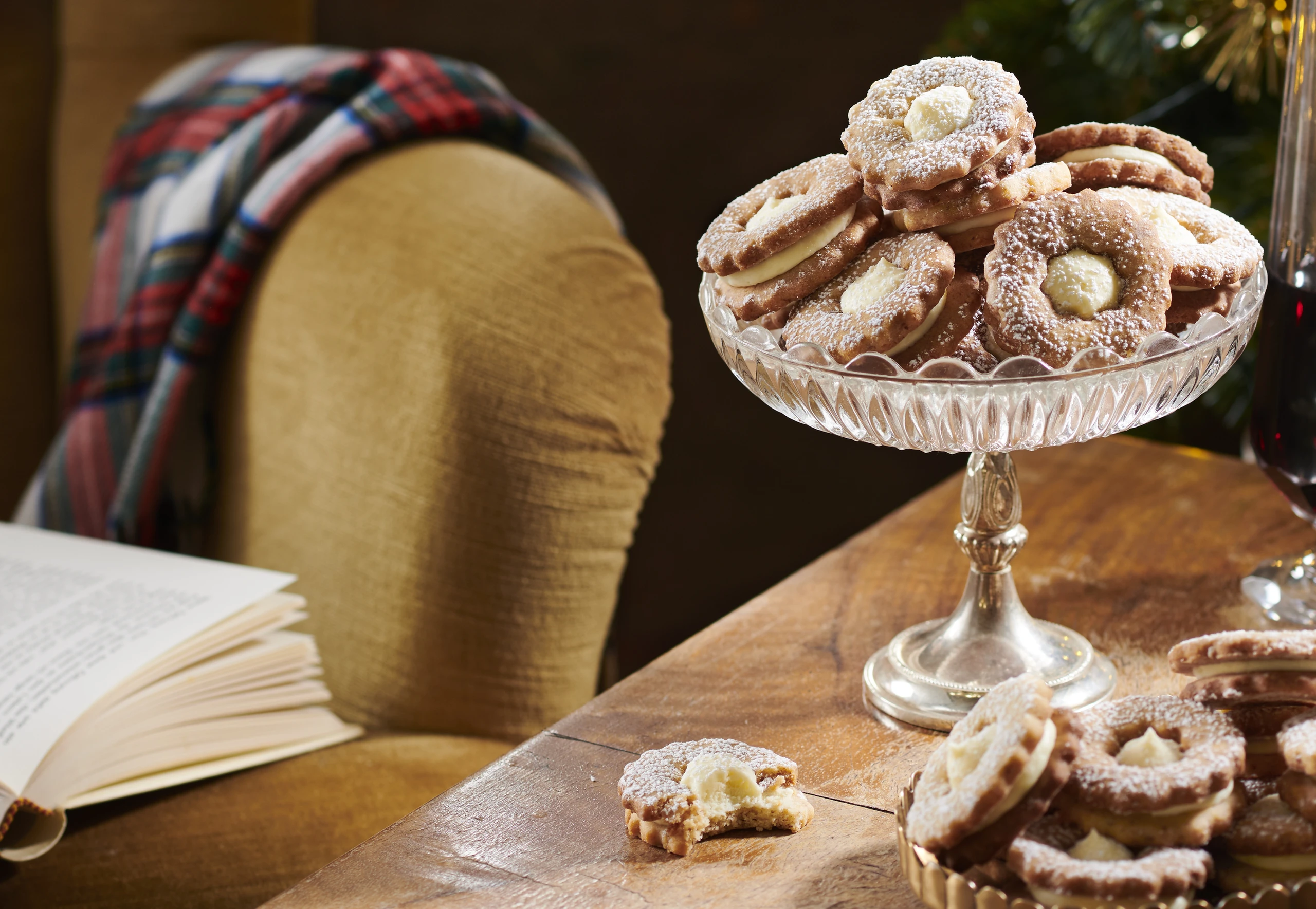 Creme mit dem Mixer kurz aufschlagen, bis sie streichfähig wird. (Wird sie zu lange geschlagen, flockt sie aus.) Creme in einen Dressiersack füllen und Tupfen auf die Kekse dressieren. Keksdeckel darauf setzen und leicht andrücken. Kekse mit Staubzucker bestreuen, in eine Dose schichten und an einem kühlen Ort aufbewahren.