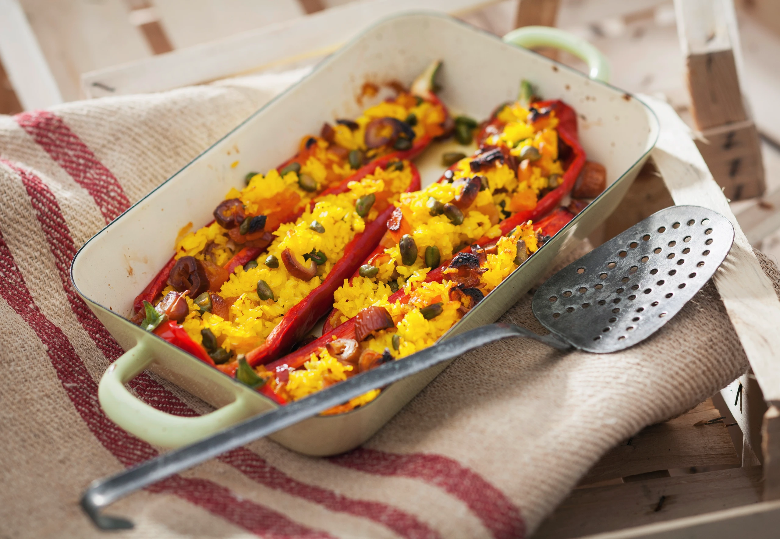 Rohr auf 160°C vorheizen. Auflaufform mit 3 EL vom Öl ausstreichen. Paprika längs halbieren und putzen. Paprikahälften mit der Reismasse füllen, in die Form setzen und mit übrigem Öl beträufeln. Paprika ins Rohr (untere Schiene / Gitterrost) schieben und ca. 25 Minuten garen; gegen Ende der Garzeit mit Folie zudecken.