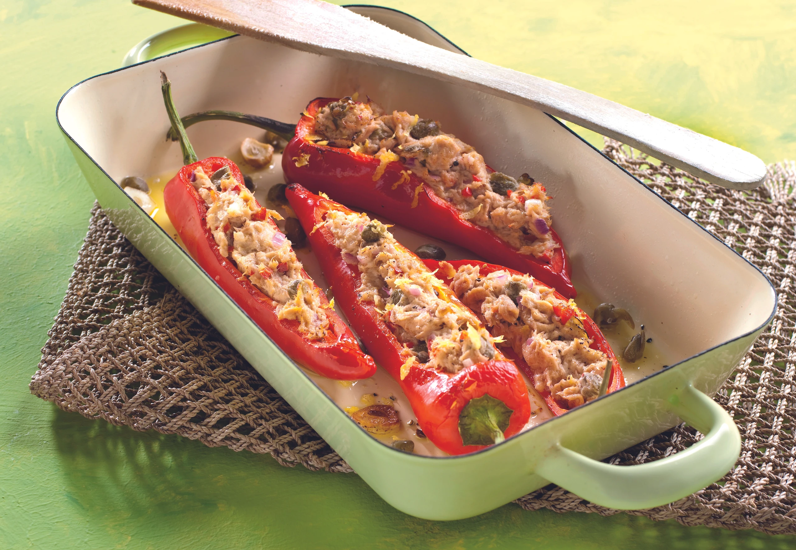 Für die Fülle Thunfisch in einem Sieb gut abtropfen lassen und in kleine Stücke teilen. Zwiebel und 1 Knoblauchzehe schälen. Paprikadeckel und Zwiebel klein schneiden. Knoblauch zerdrücken. Thunfisch mit Paprika, Zwiebel, Knoblauch, Zitronensaft, abgeriebener Zitronenschale, Crème fraîche, Senf, Ketchup und Paprikapulver verrühren. Masse mit Salz und Pfeffer würzen.