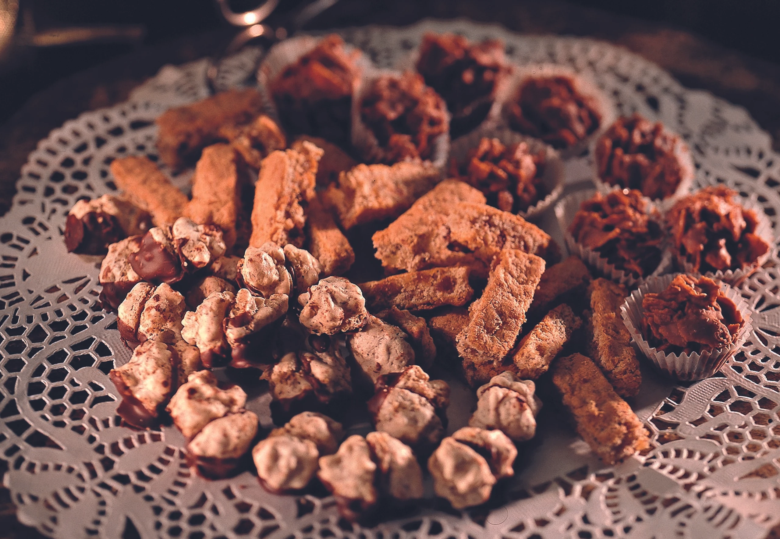 3 Backbleche mit Backpapier belegen. Eiklar mit ganz wenig Salz zu cremigem Schnee schlagen, mit Zucker verrühren und steif ausschlagen. Nüsse und Mandeln unterheben. Backrohr auf 180 °C vorheizen.