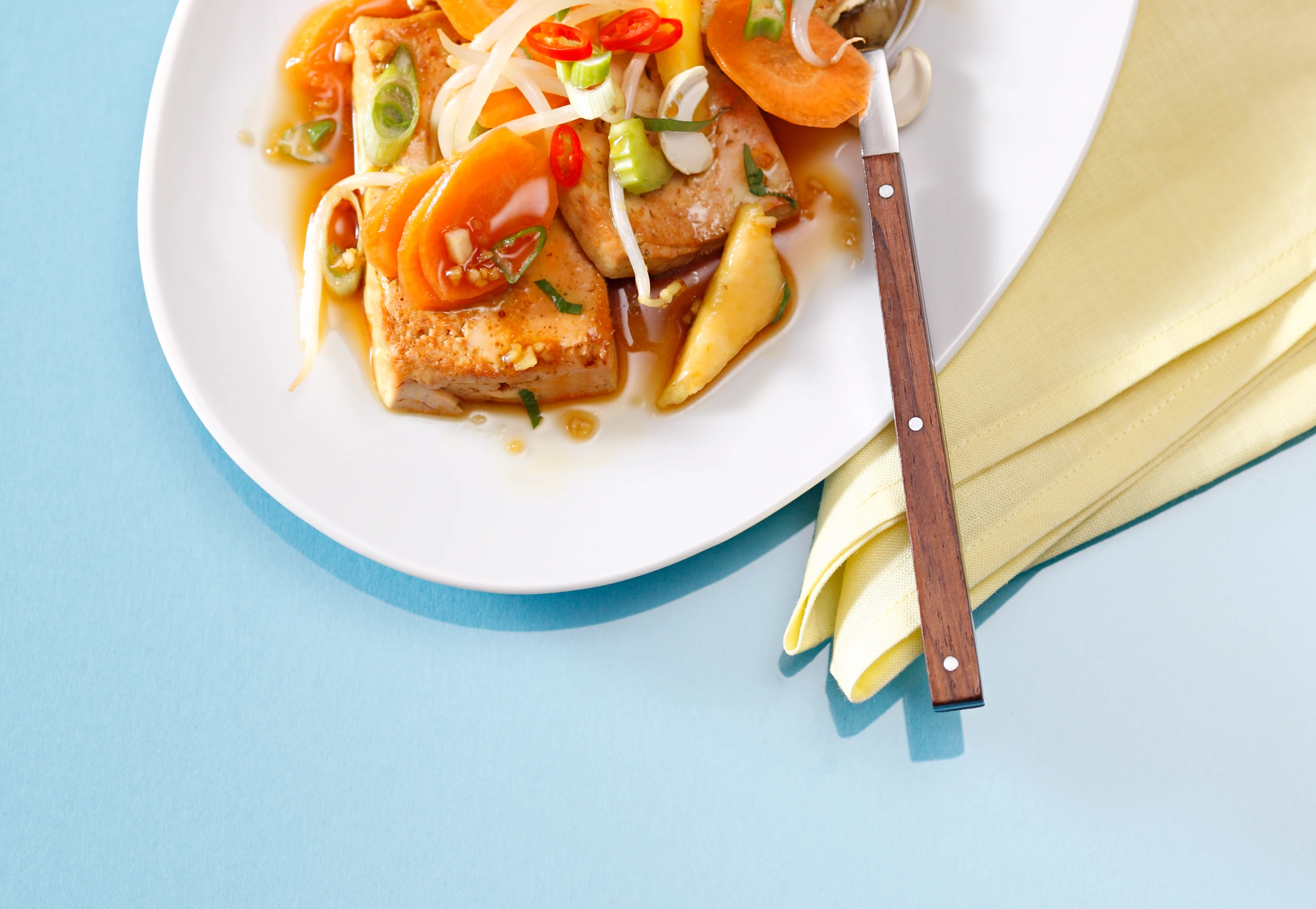 Tofu in dünne Scheiben schneiden. Knoblauch schälen und fein hacken. Sojasauce, Knoblauch, Curry und Ingwer verrühren. Tofu mit der Marinade übergießen und ziehen lassen.