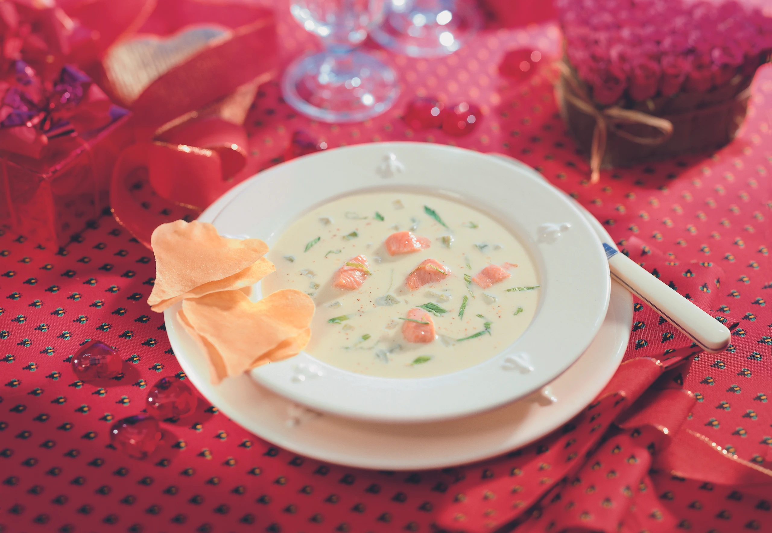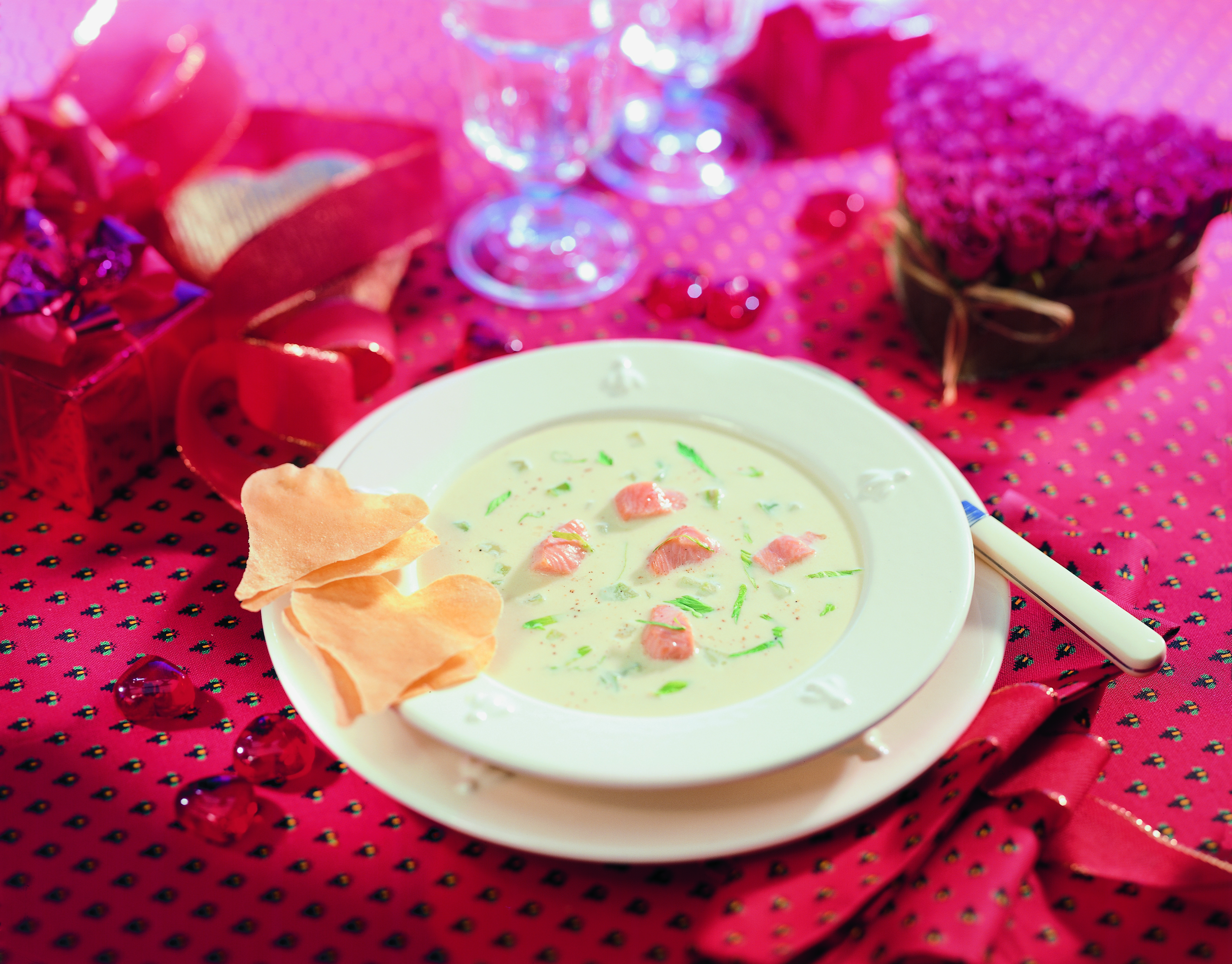 Stangensellerie-Cremesuppe mit Lachsforelle und Strudelteig-Herzen