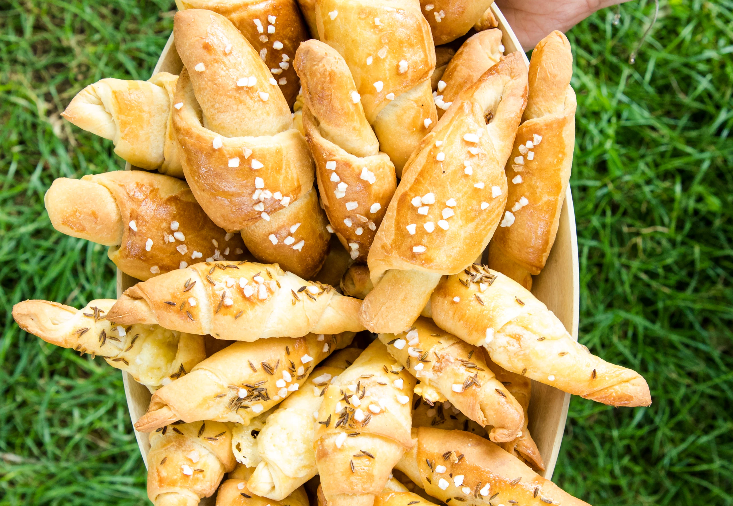 Für die Käsestangerl Käsescheiben längs dritteln. Käsestangerl wie die Speckstangerl fertig stellen, mit Ei bestreichen, mit Kümmel und restlichem grobem Salz bestreuen und auf das Backblech geben. Stangerl im Rohr (mittlere Schiene) ca. 15 Minuten backen, herausnehmen und abkühlen lassen.