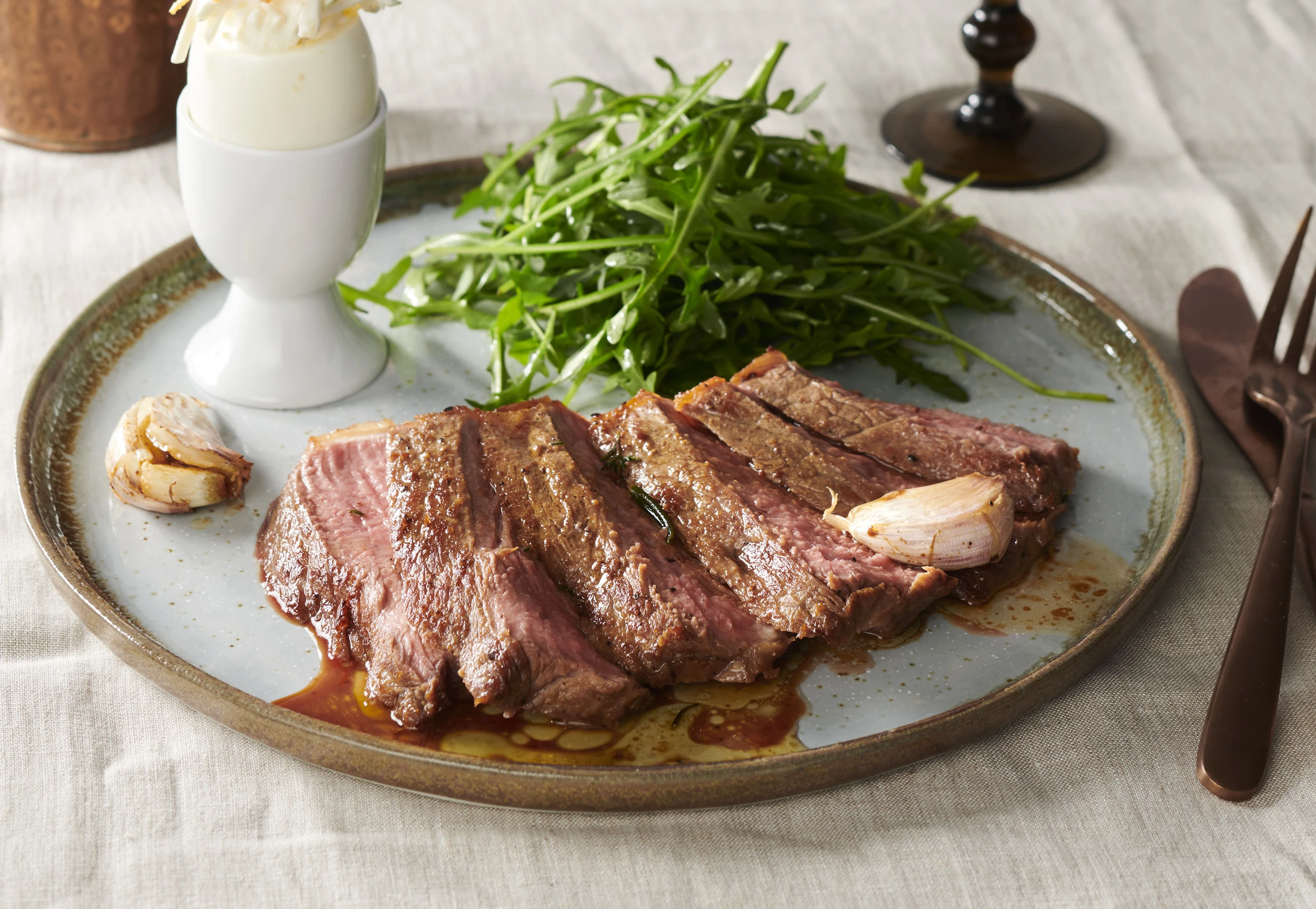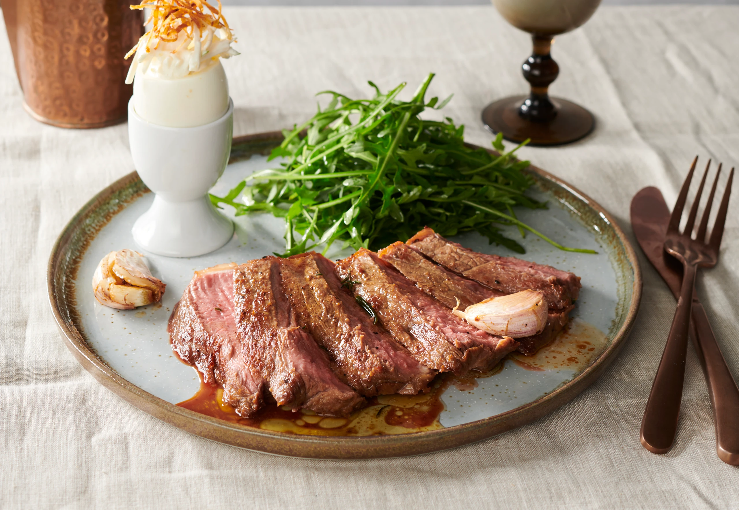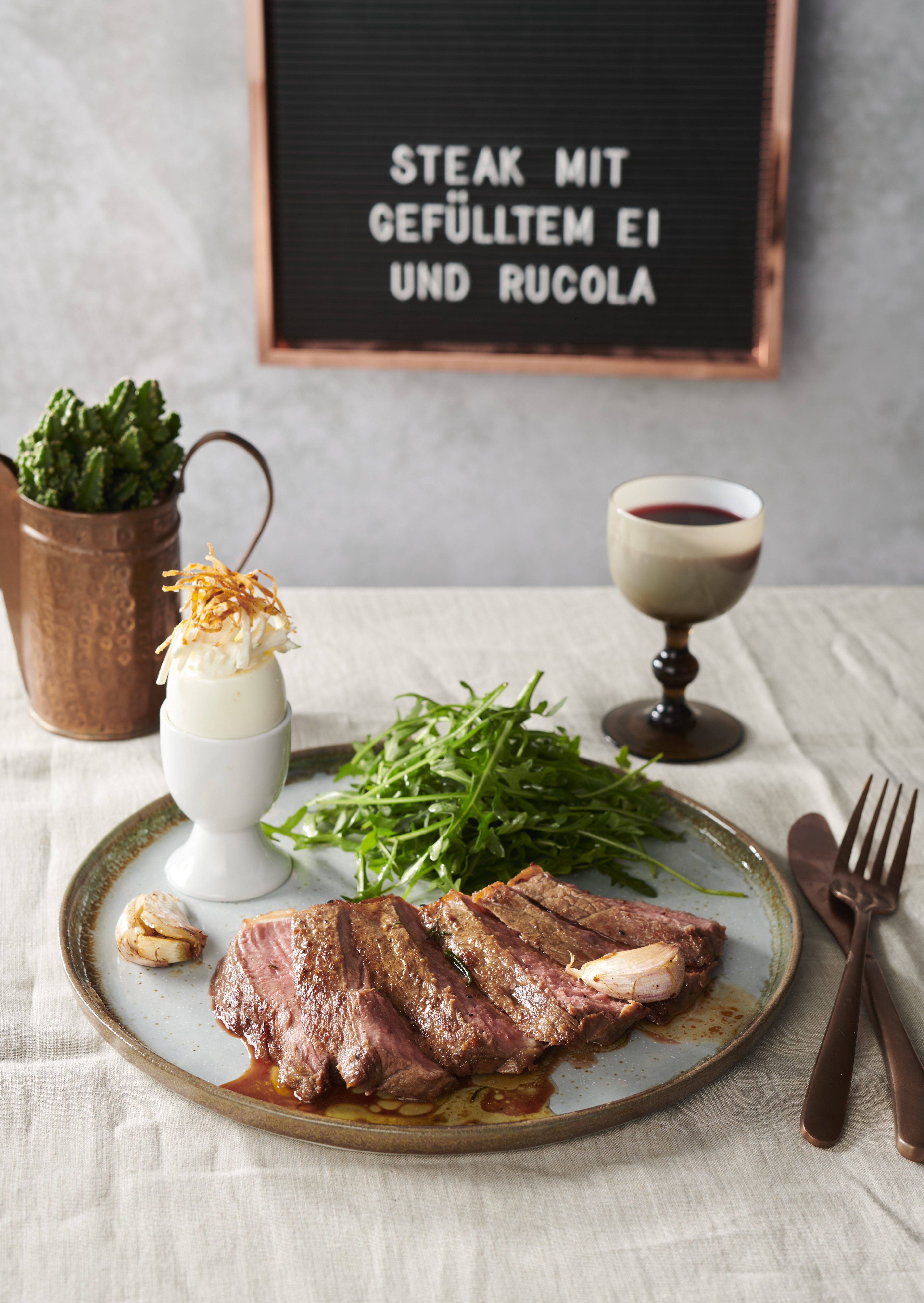 Steaks in Scheiben schneiden und mit den gefüllten Eiern und dem Rucolasalat servieren.