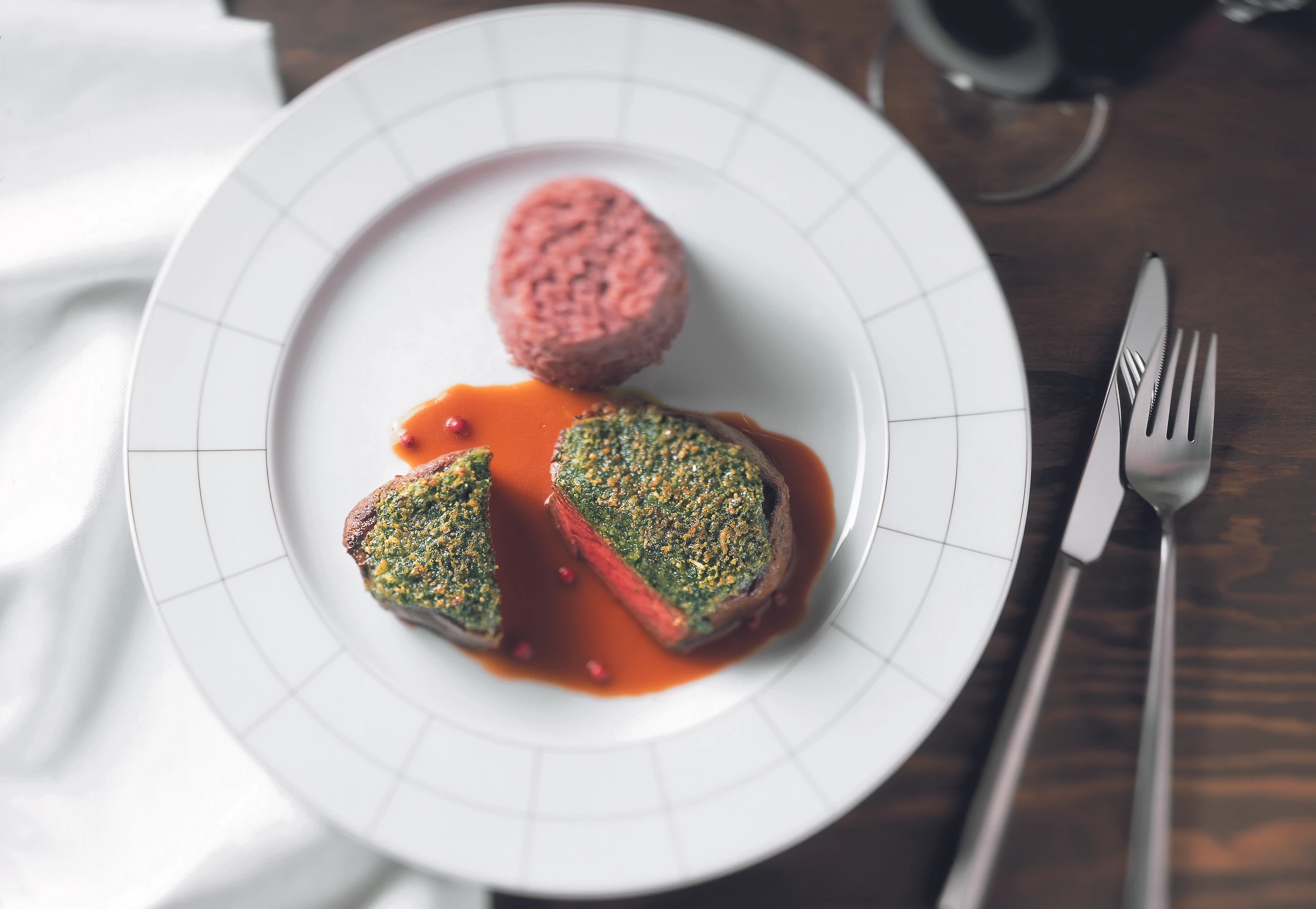 Steak mit Mandel-Kräuter-Kruste und Rotwein-Reis