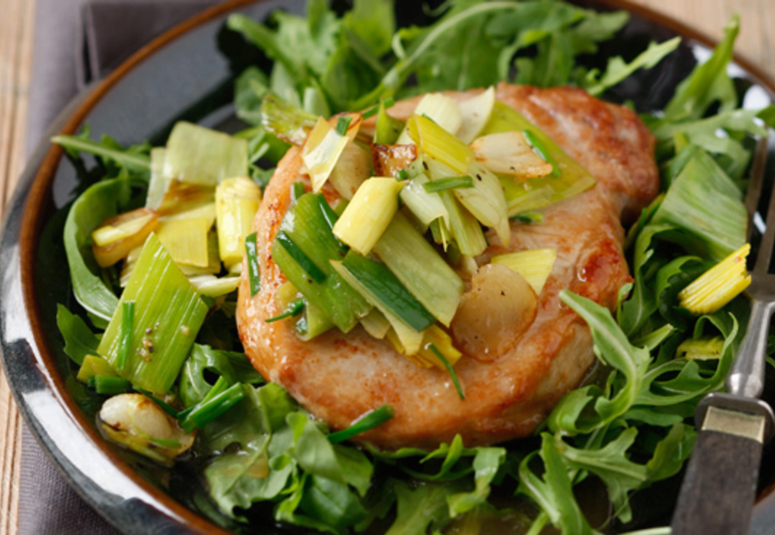 - Knoblauch schälen und in dünne Scheiben schneiden. Lauch quer in ca. 3 cm breite Scheiben, Schnittlauch grob schneiden. Knoblauch in 1 EL Butter hell anschwitzen. Lauch und Schnittlauch untermischen, mitbraten, mit Salz und Pfeffer würzen.