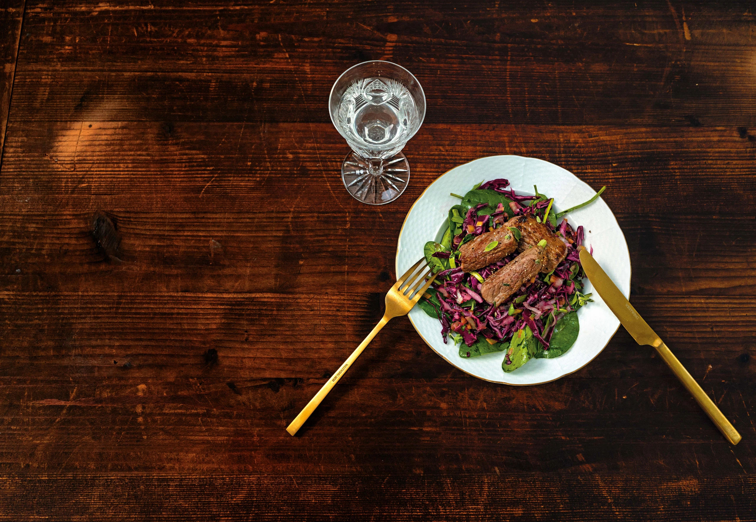 Steak mit Rotkraut-Lauchsalat und Spinat