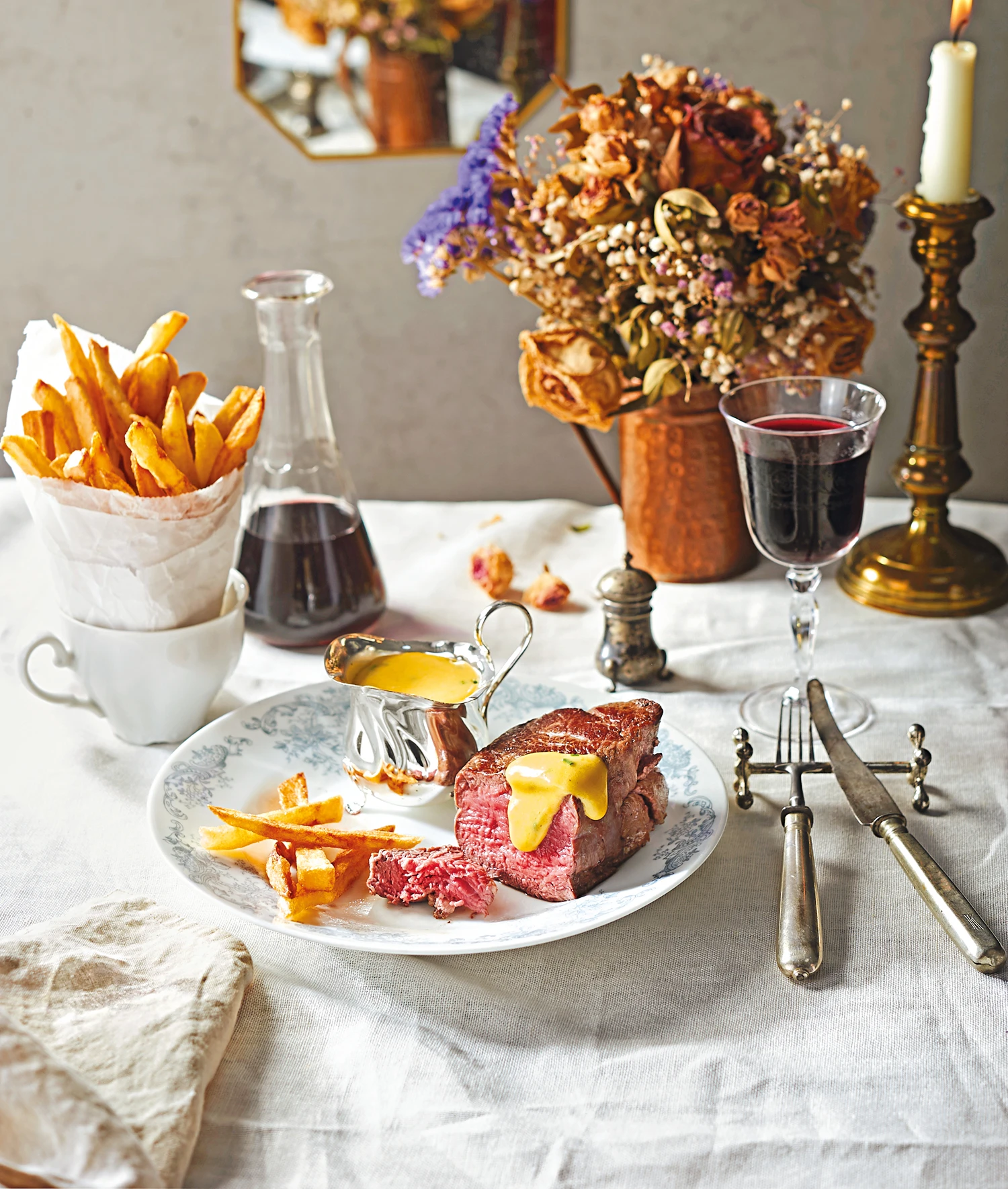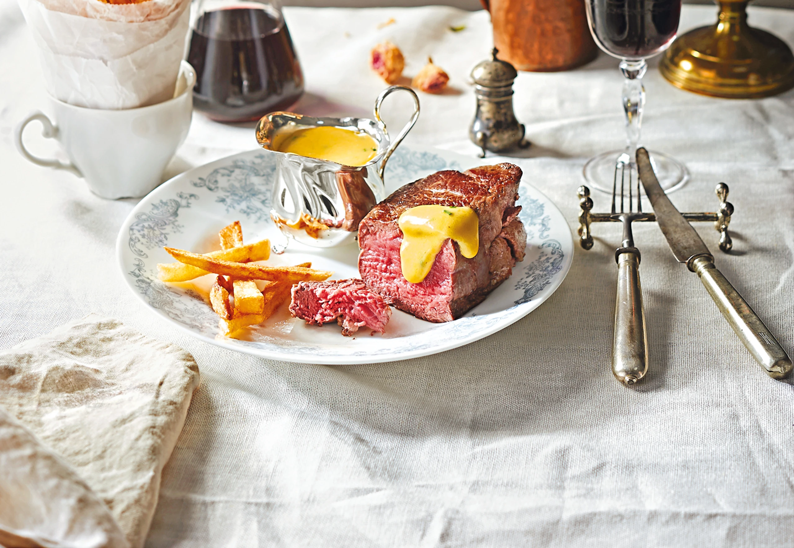 Für die Sauce béarnaise Schalotte schälen, würfeln und in Butter anschwitzen. Estragonstiele zugeben. Mit Weißwein und Essig ablöschen. Pfeffer zugeben und den Ansatz einkochen lassen. Durch ein Sieb leeren und mit Dottern über Wasserdampf cremig schlagen. Zerlassene Butter unter Rühren zugießen. Gehackten Estragon untermischen. Steaks mit Sauce béarnaise und Pommes servieren.