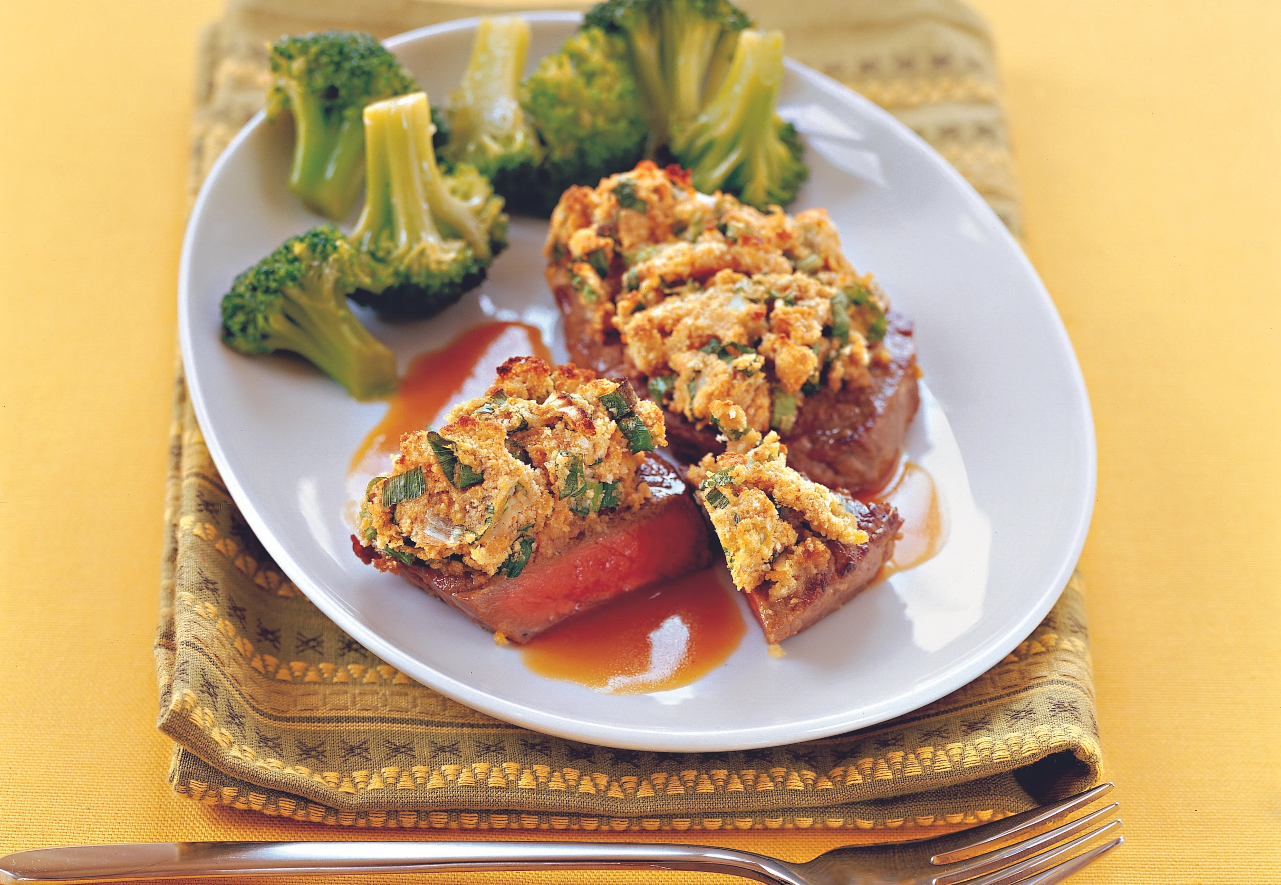 Steaks salzen, pfeffern und im Öl beidseitig anbraten. Hitze reduzieren, Steaks fertig braten, in die Form geben und mit der Krustenmasse bestreichen. Steaks im Rohr (obere Schiene / Gitterrost) ca. 1/2 Minute überbacken.