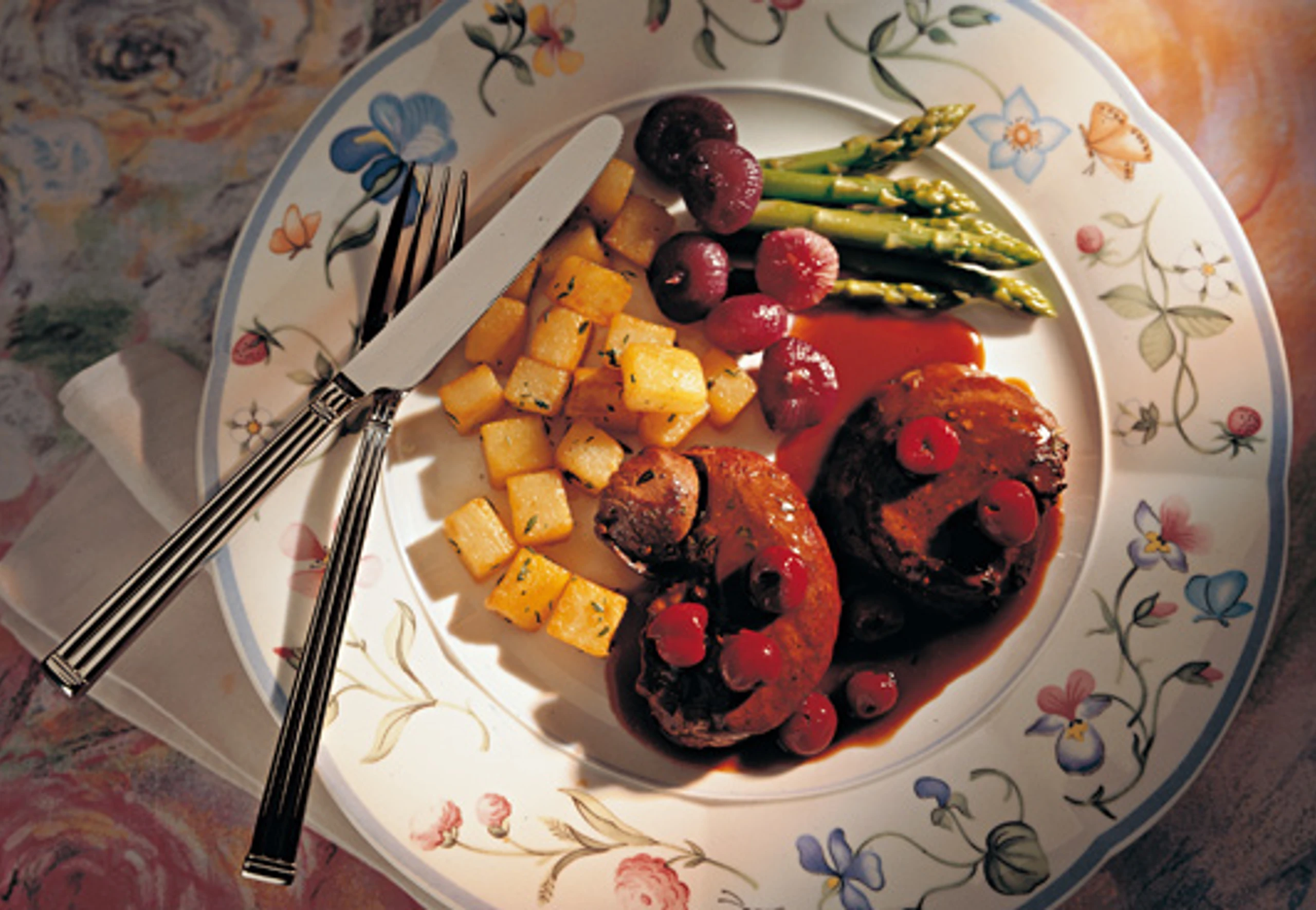 - Fleisch mit der Portwein-Sauce und den Kirschen anrichten. Als Beilagen serviert man am besten Spargel und gebratene Erdäpfel mit frischem Thymian.
