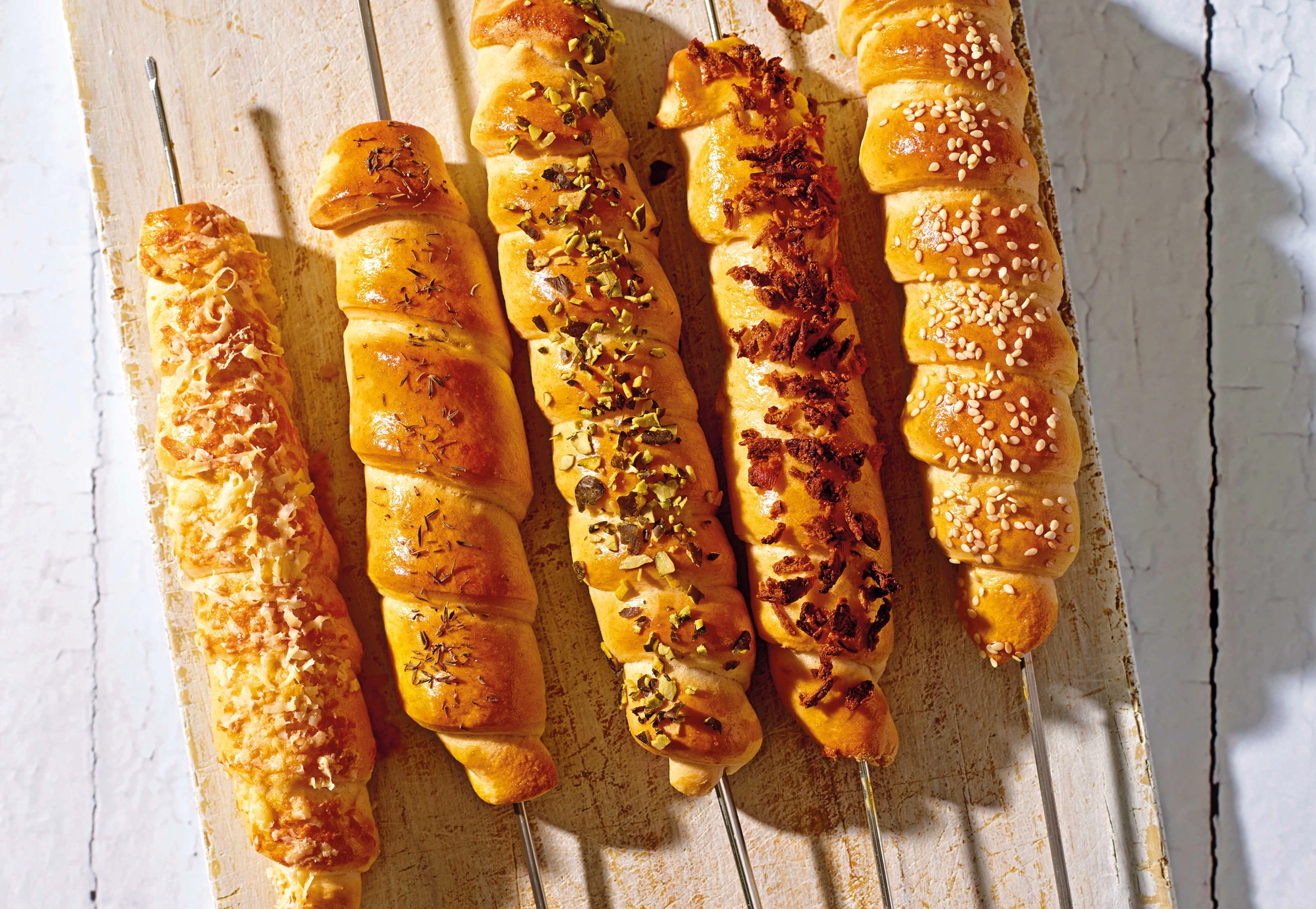 Rohr auf 200 °C Ober-/Unterhitze vorheizen. Backblech mit Backpapier belegen. Spieße darauflegen und mit Ei bestreichen. Nach Lust und Laune mit Speckstückchen, Parmesan, Sesam, Kräutern, Kürbiskernen oder Röstzwiebeln bestreuen. Im Rohr (mittlere Schiene / Gitterrost) ca. 15 Minuten goldbraun backen.