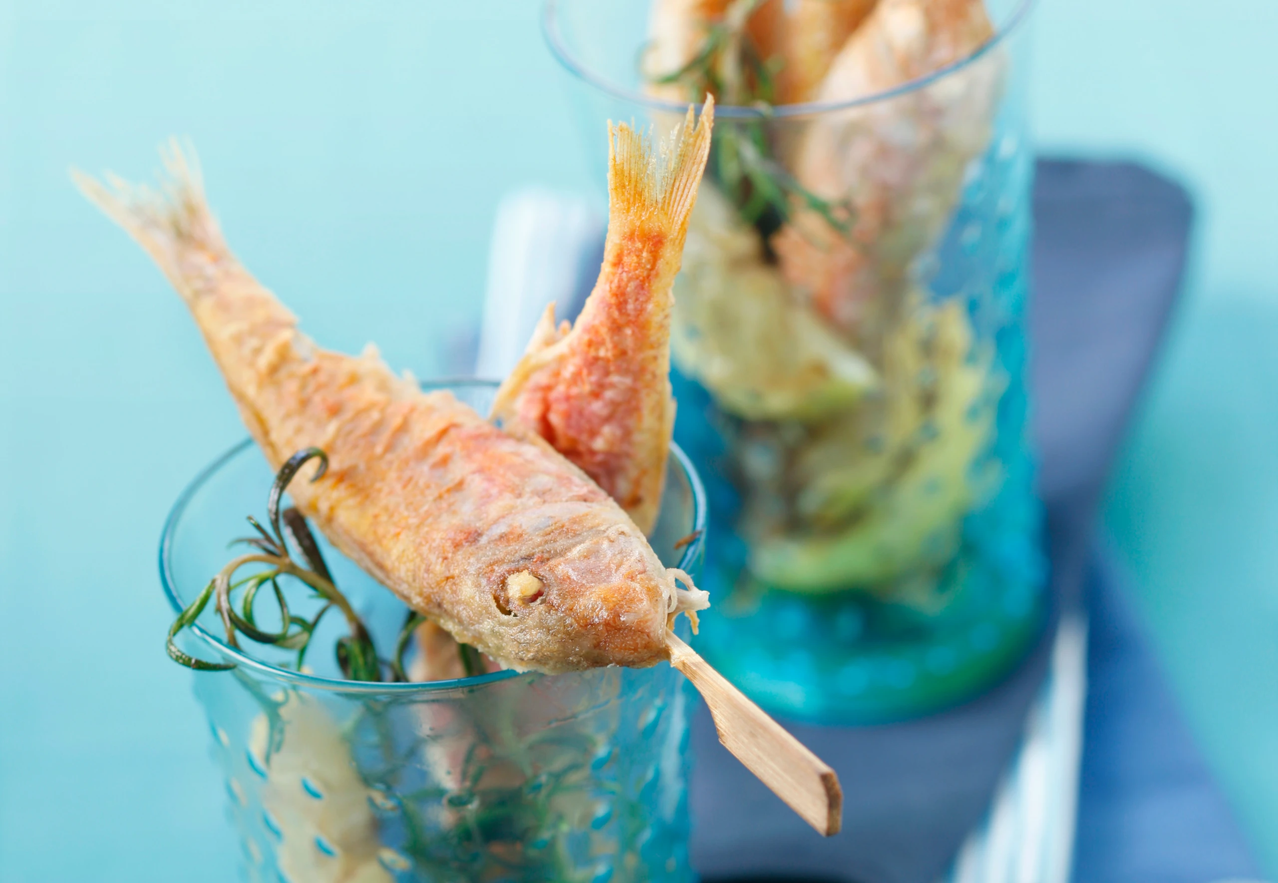 Fische mit Salz würzen und auf Spieße stecken. In Mehl wenden, überschüssiges Mehl abklopfen. Zitronen in Stücke schneiden.