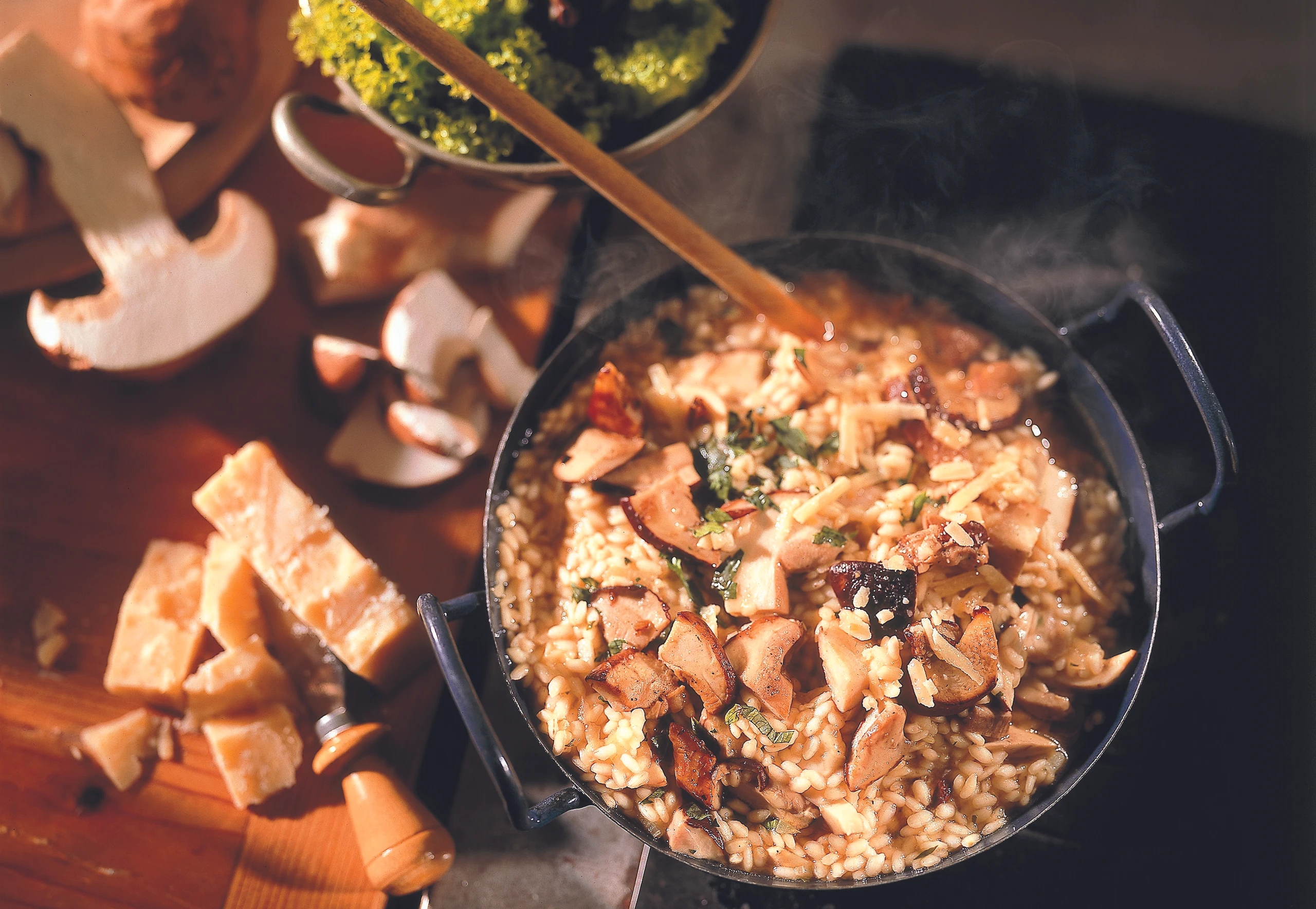 - Reis bissfest köcheln (dauert insgesamt ca. 20 Minuten) – nach ca. 15 Minuten die Steinpilze zugeben. Das Risotto soll immer dickbreiig sein. Falls nötig etwas mehr Suppe zugießen. Am Ende der Garzeit soll der Reis noch leichten Biss haben.