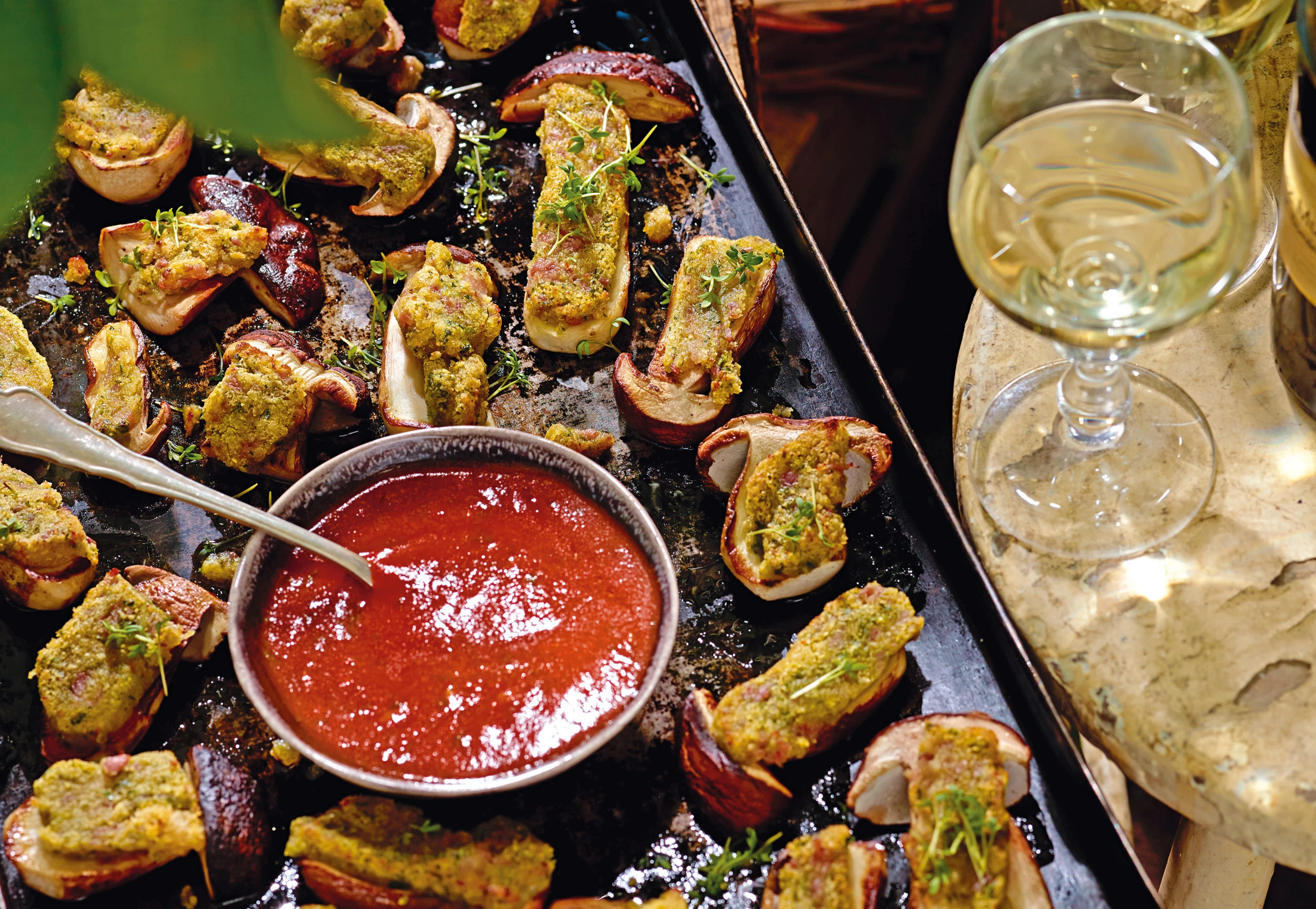 Steinpilze mit Prosciutto-Pignolikruste und Paradeisfond