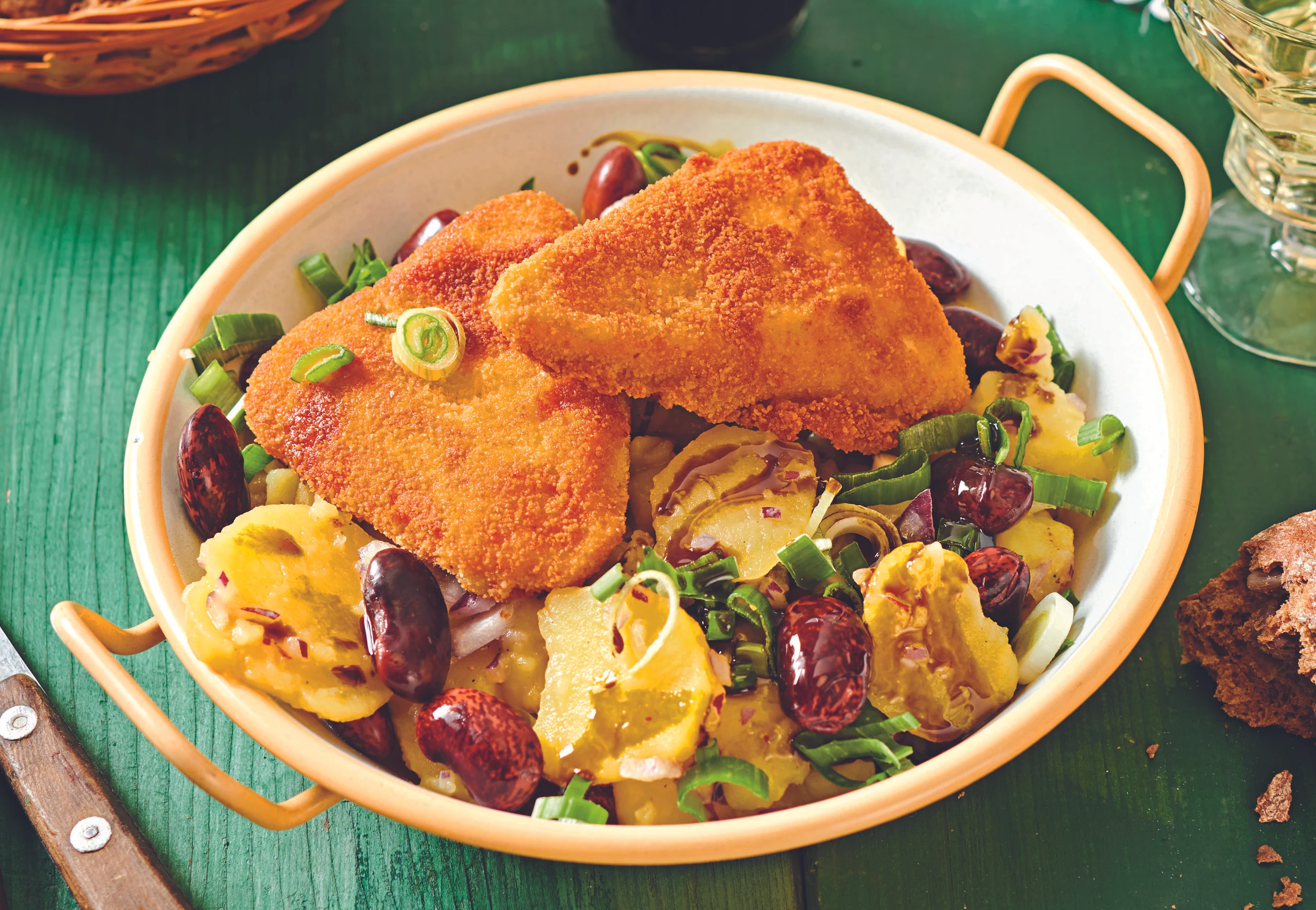 Hühnerfilet längs halbieren, beidseitig salzen und pfeffern. In Mehl, Eiern und Bröseln panieren.