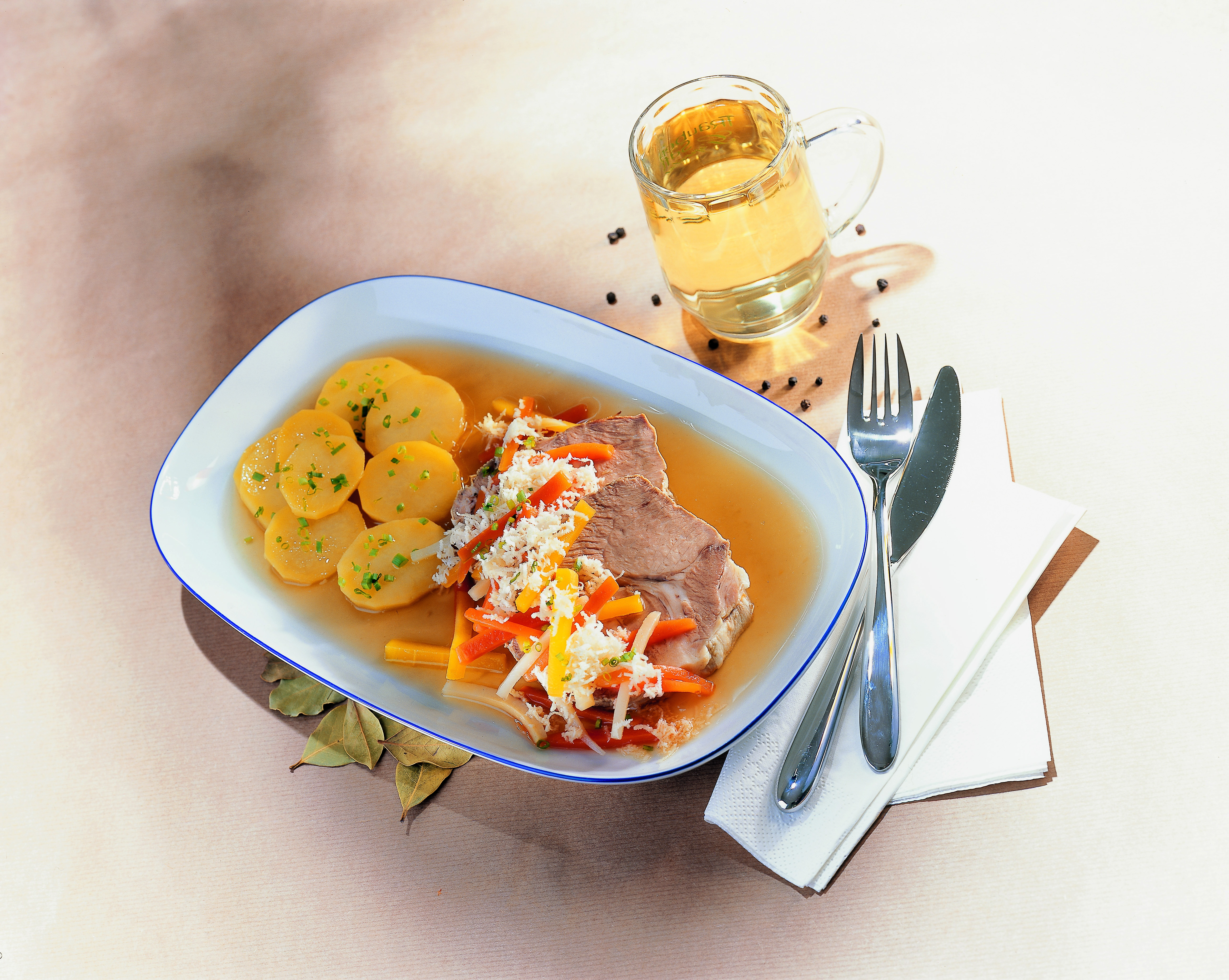 - Ca. 3 l Wasser mit 1 EL Essig mischen und aufkochen. Fleisch, 5 Pfefferkörner, 1 Lorbeerblatt und einige Kräuterstiele hineingeben. Topf bis auf einen kleinen Spalt zudecken und das Fleisch auf kleiner Flamme ca. 11/2 Stunden köcheln – nach halber Garzeit salzen.