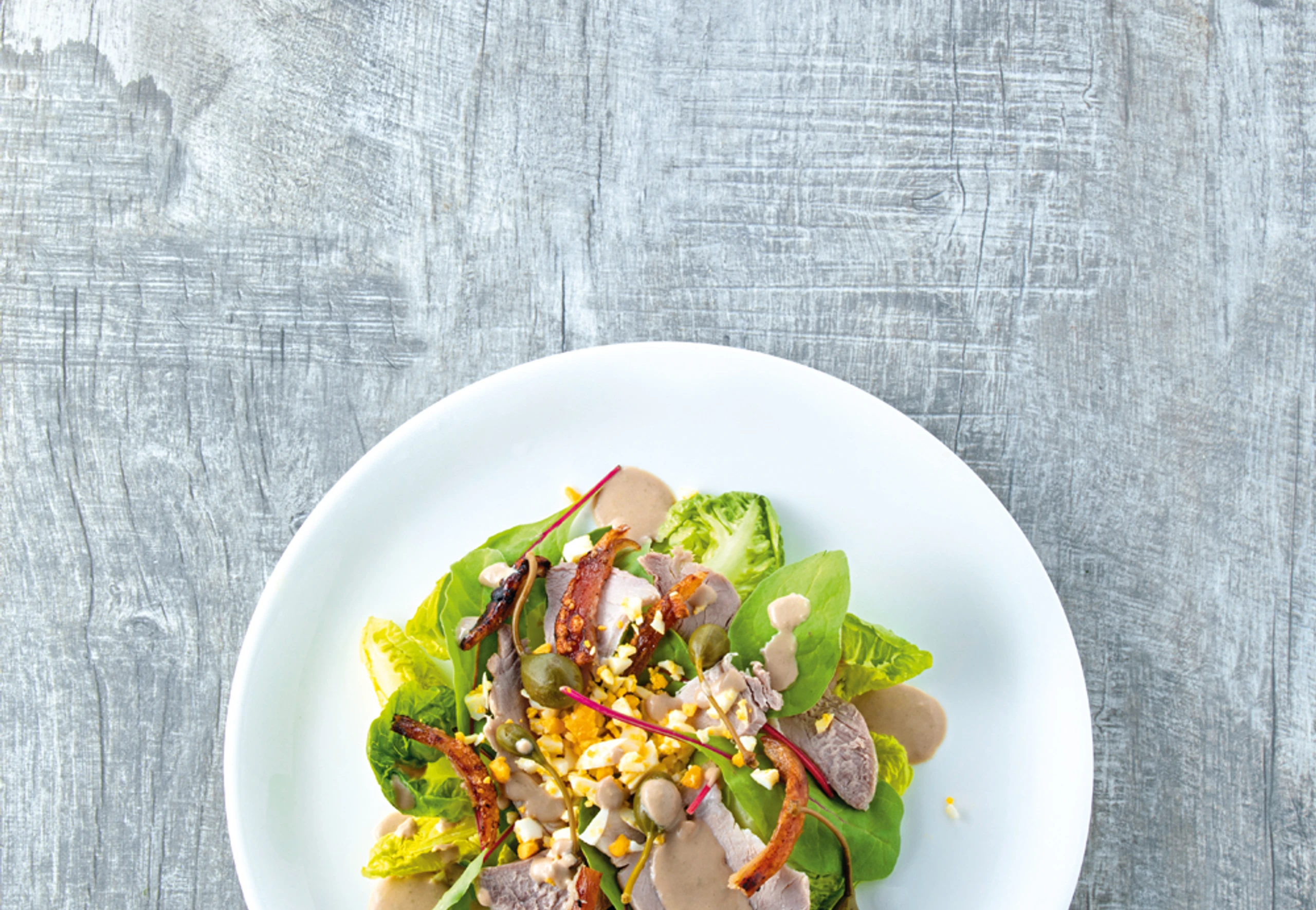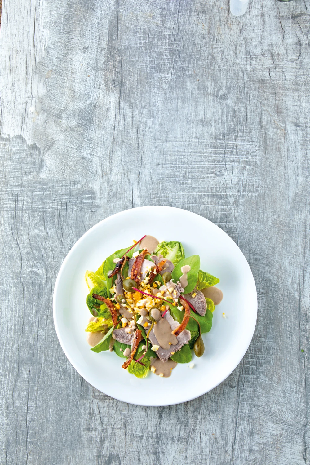 Salat und Mangold anrichten, mit Fleisch, Kapern und Krustenstücken belegen. Mit Eiern bestreuen und mit der Sauce beträufelt servieren.