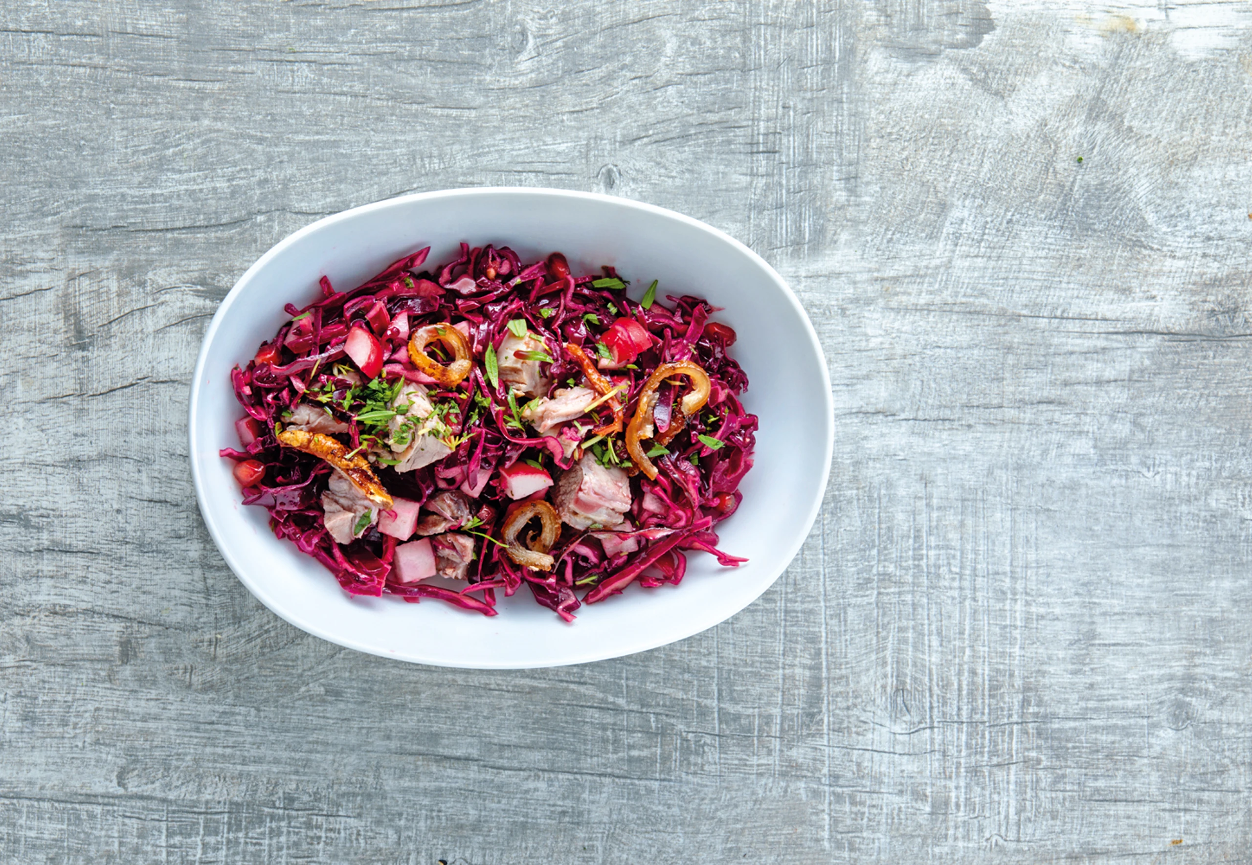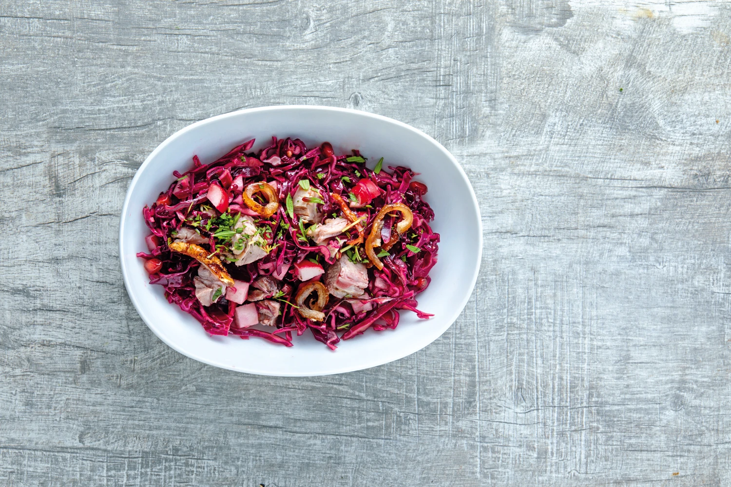 Stelzen-Rotkrautsalat mit Rettich und Nuss-Orangendressing