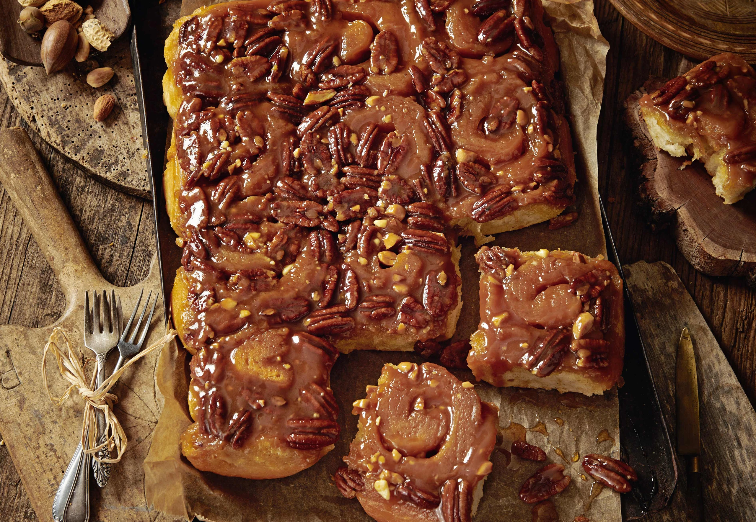 Rohr auf 180 °C Ober-/Unterhitze vorheizen. Teig auf einer leicht bemehlten Arbeitsfläche rechteckig ausrollen. Mit Karamell bestreichen, mit Pekannüssen und Kuvertüre bestreuen. Teig von unten nach oben eng einrollen und in 12 Stücke schneiden. Teigschnecken auf dem Blech mit den Nüssen verteilen.