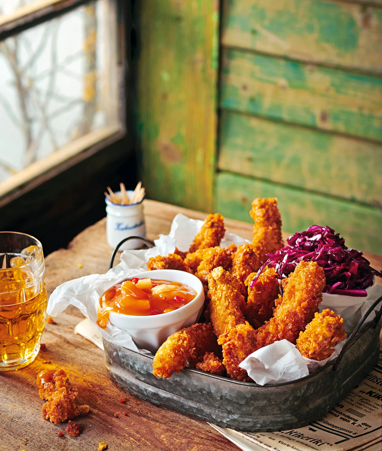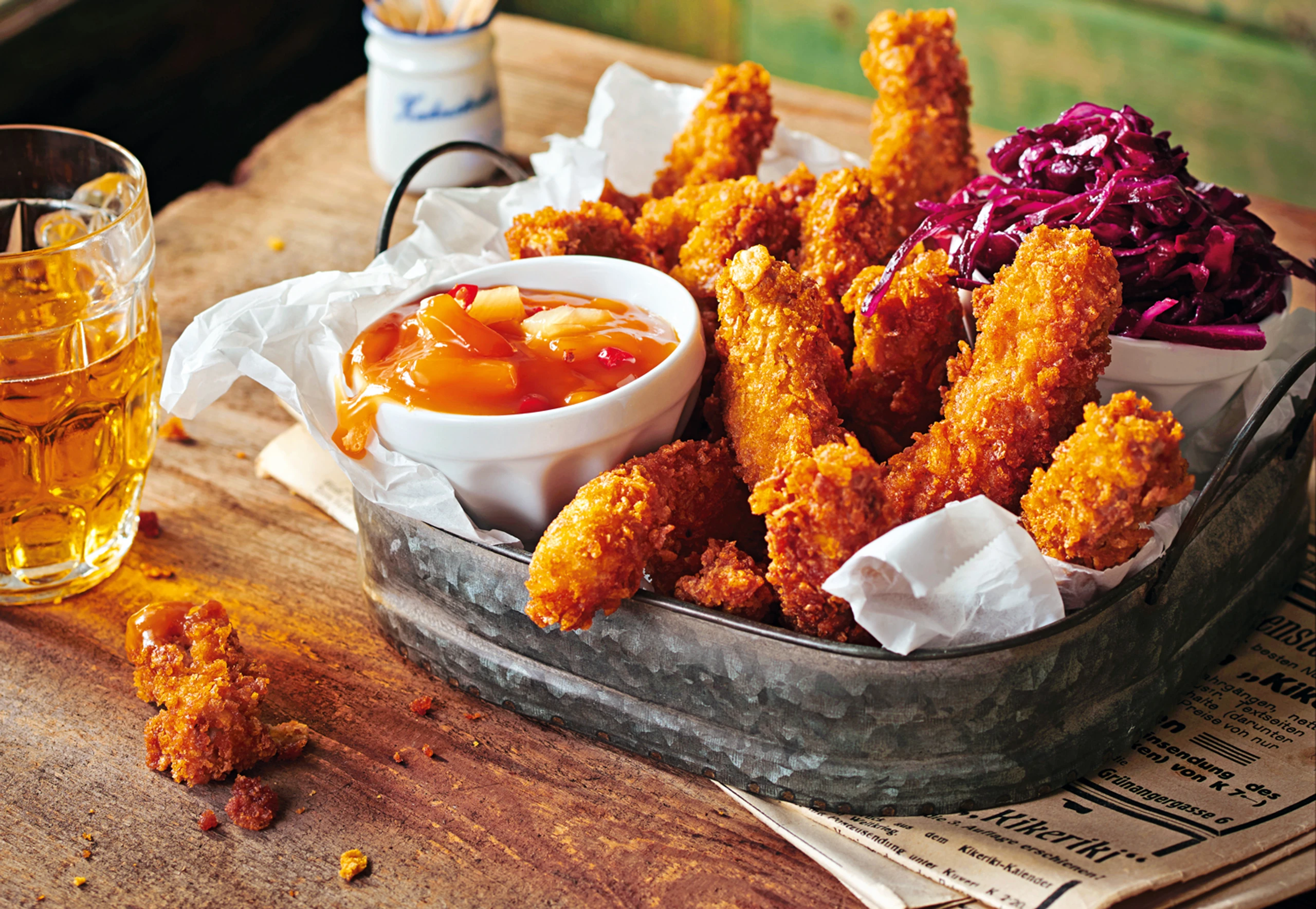In einer Pfanne ca. 2 Finger hoch Öl erhitzen. Fleisch darin knusprig backen. Herausnehmen und auf Küchenpapier abtropfen lassen. Sticky Fingers mit Salat und Sauce servieren.