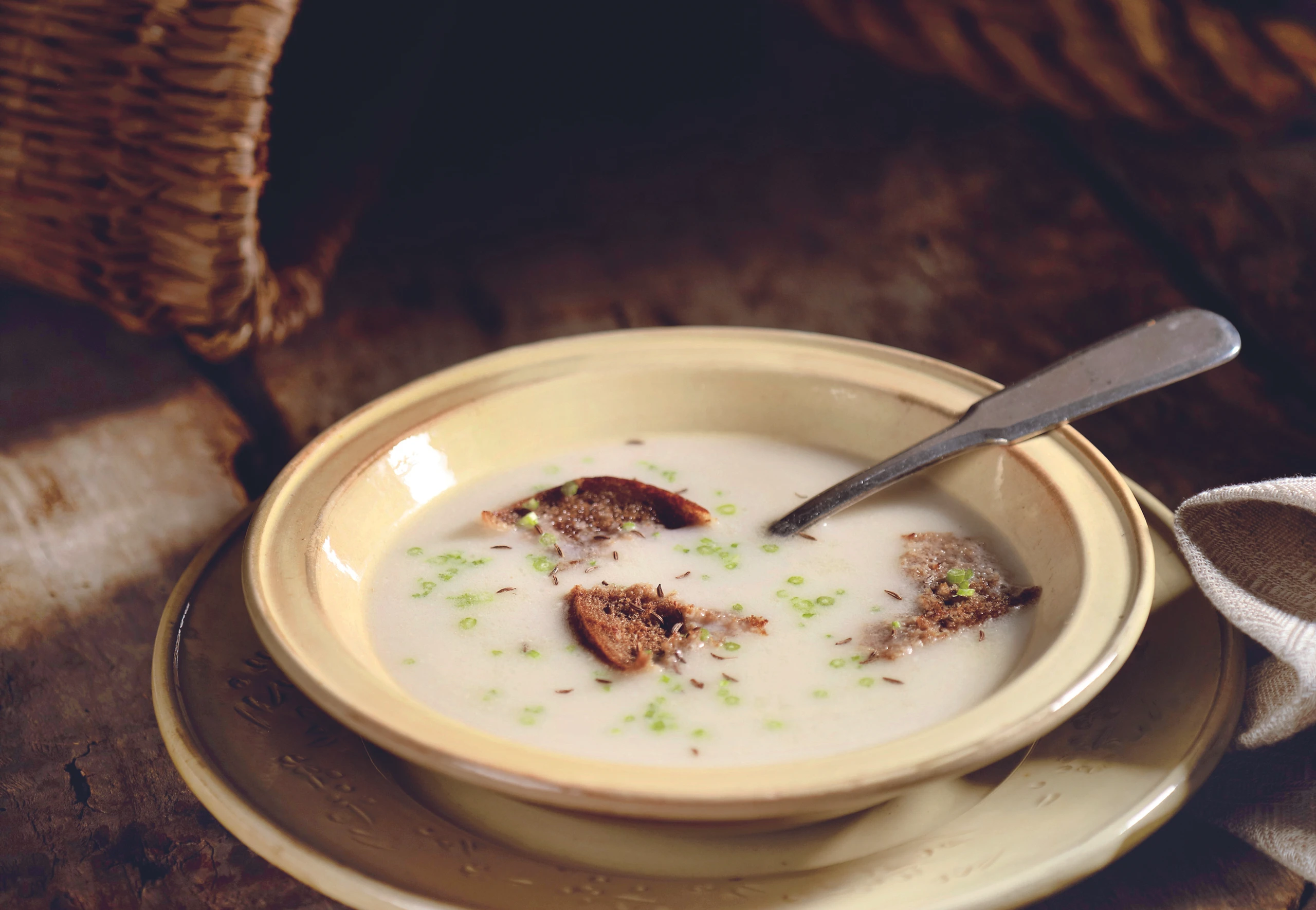 - Wasser mit Kümmel aufkochen und ca. 15 Minuten köcheln. Sauerrahm mit Mehl glatt rühren, in das Kümmelwasser rühren und ca. 3 Minuten köcheln. Suppe mit Salz würzen.
