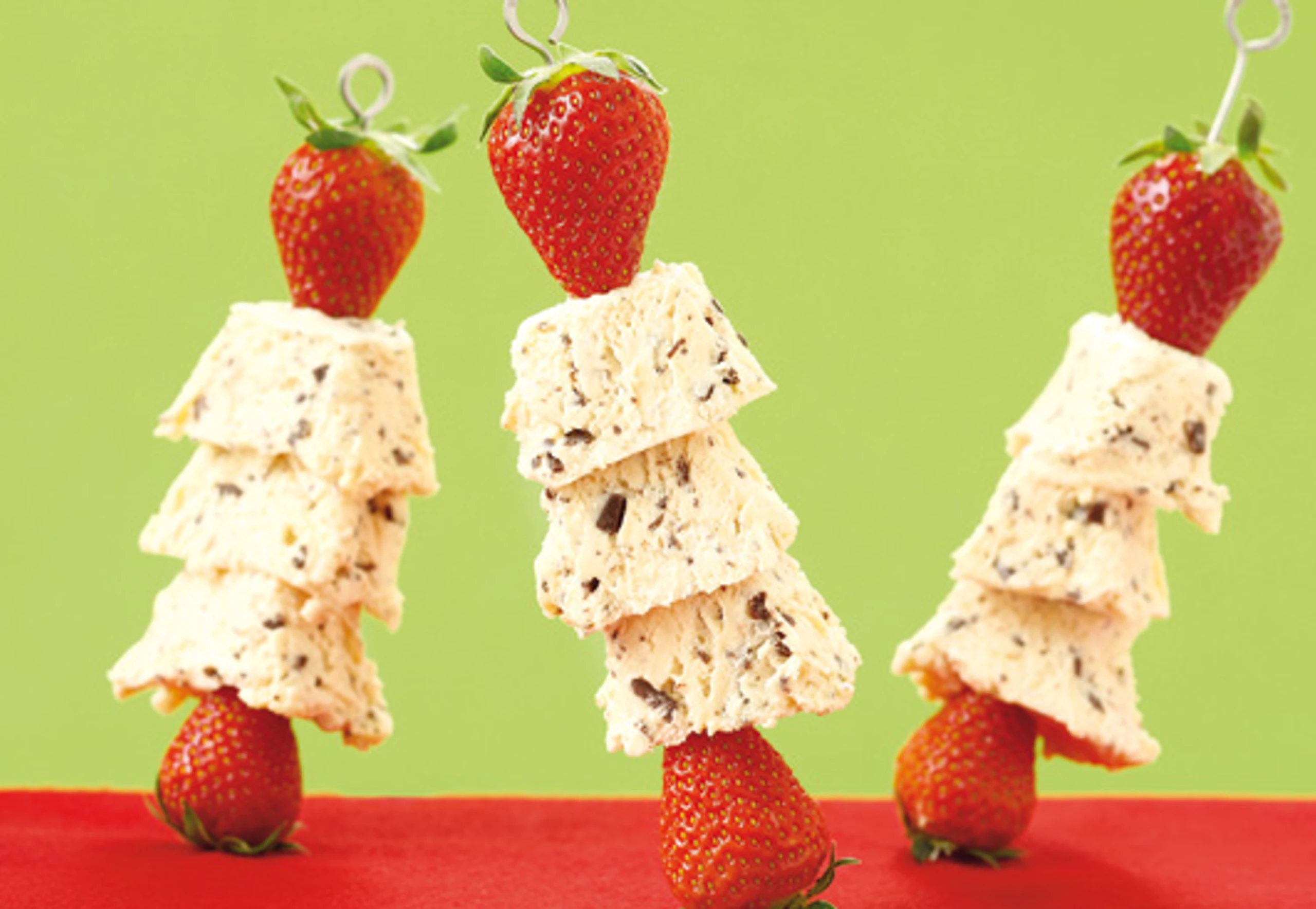 - Holz- oder Metallspieße (nicht zu dick, damit die Eiswürfel beim Aufspießen nicht brechen) vorbereiten. Eiswürfel mit einem kleinen Messer aus der Form lösen. 1 Erdbeere, 3 Stracciatella-Eiswürfel und abschließend 1 Erdbeere auf jeden Spieß stecken. Sofort vernaschen!