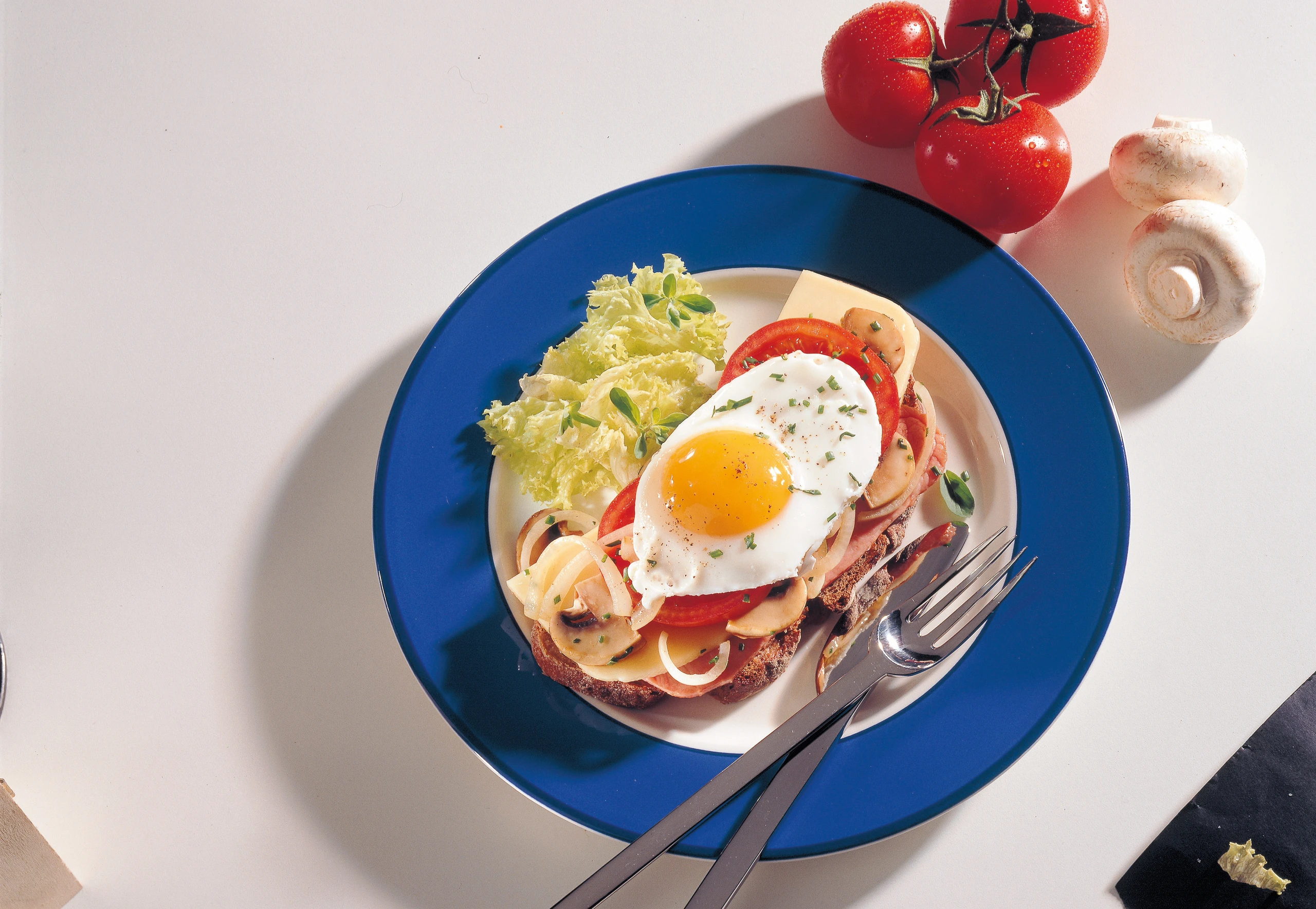 Im Bratrückstand Zwiebel und Paprika anschwitzen, salzen, pfeffern, auf dem Käse verteilen und mit Paradeisern belegen. Eier in 1 EL Öl braten und auf die Brote legen. Salzen, pfeffern, mit Schnittlauch und Salat garnieren.