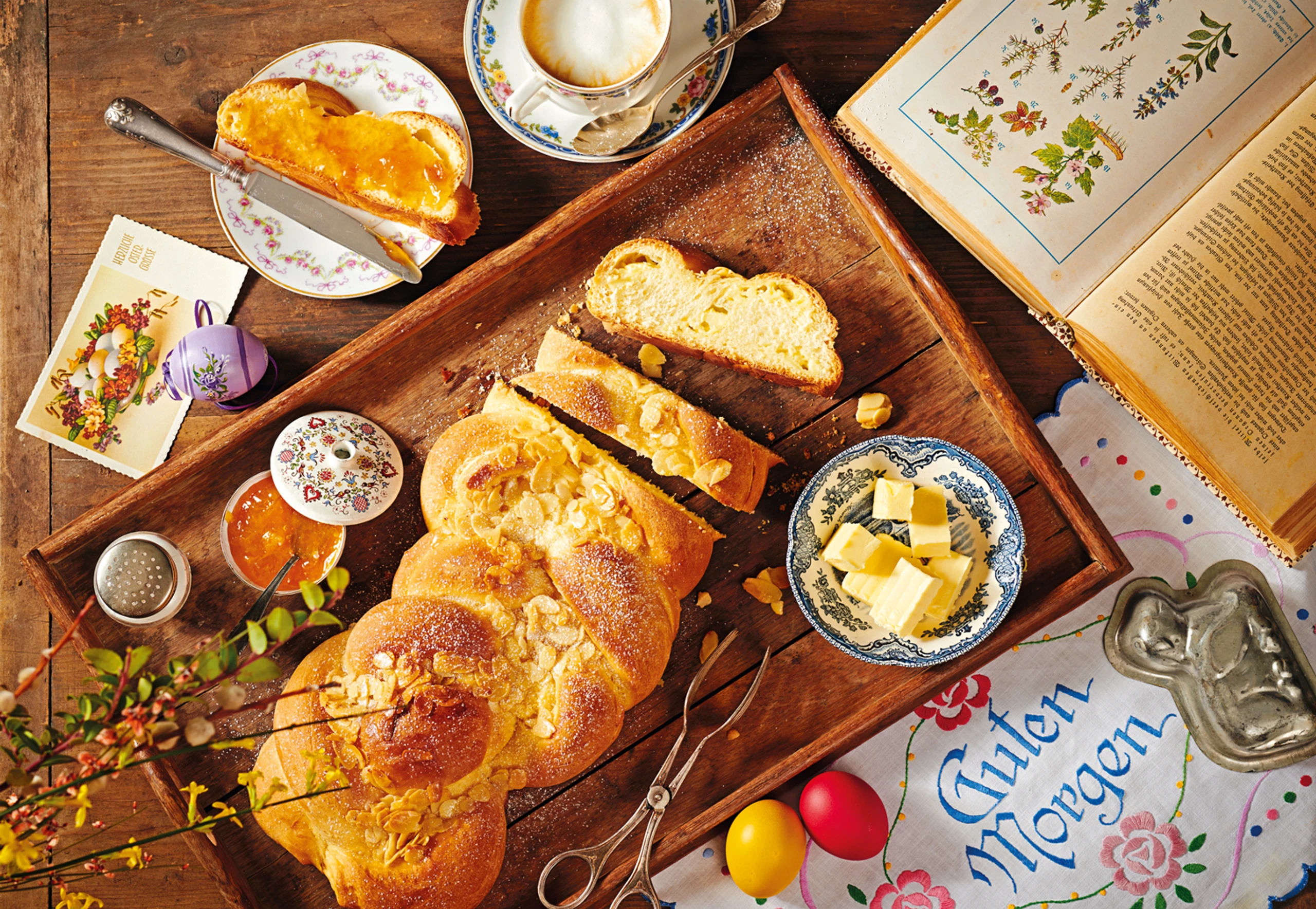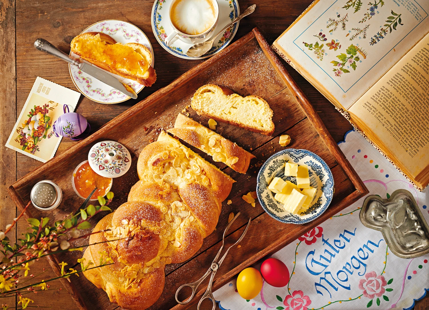 Backblech mit Backpapier belegen. Aus den 3 eingerollten Teigstreifen einen Zopf flechten und die Enden gut zusammendrücken. Auf das Blech legen, locker mit Frischhaltefolie abdecken und an einem warmen Ort ca. 30 Minuten gehen lassen.
