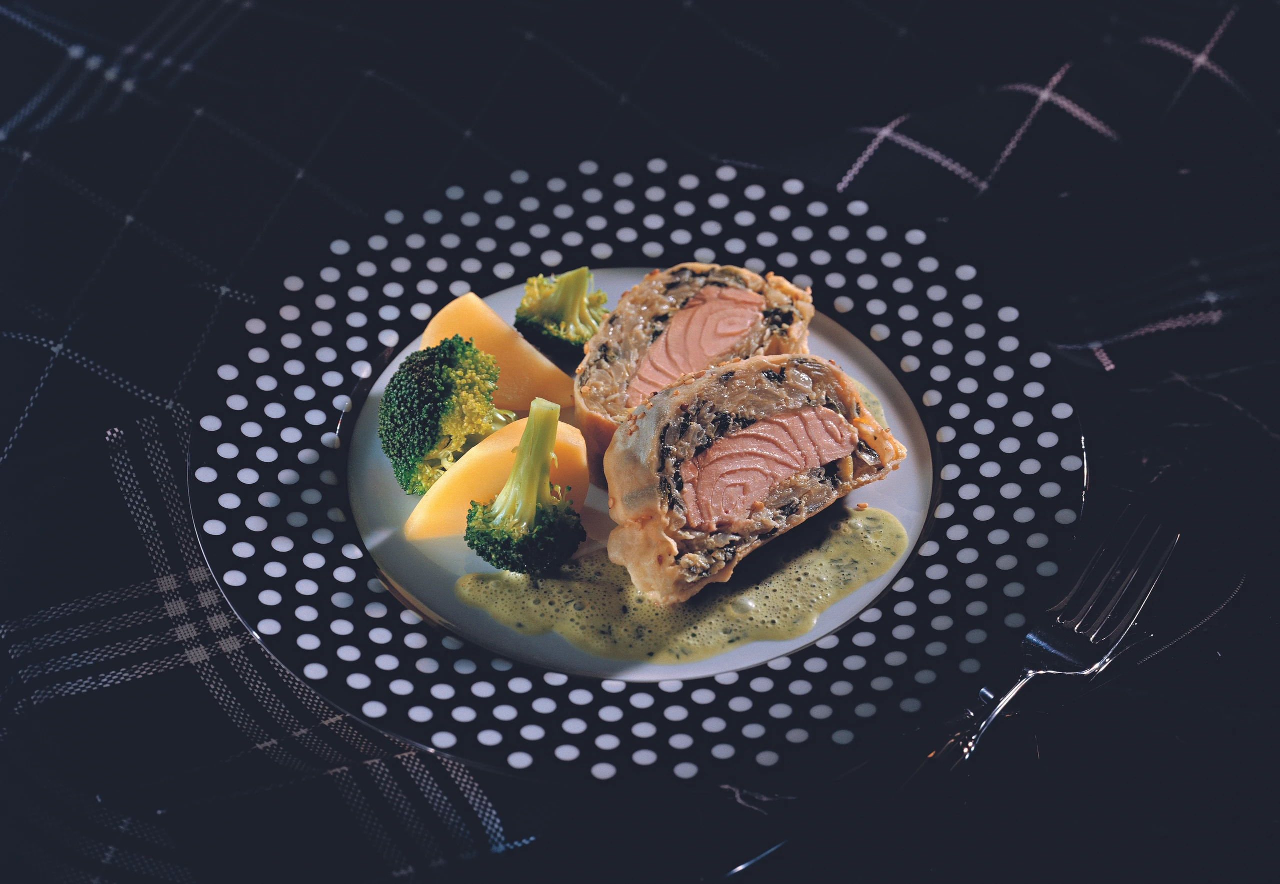 Die Hälfte der Fülle am unteren Rand auftragen, mit den Fischstücken belegen, übrige Fülle darauf verteilen. Seitenränder einschlagen und den Teig über die Fülle einrollen. Strudel auf das Backblech legen, mit zerlassener Butter bestreichen, mit Sesam bestreuen und im vorgeheizten Rohr (mittlere Schiene) ca. 1/2 Stunde backen.
