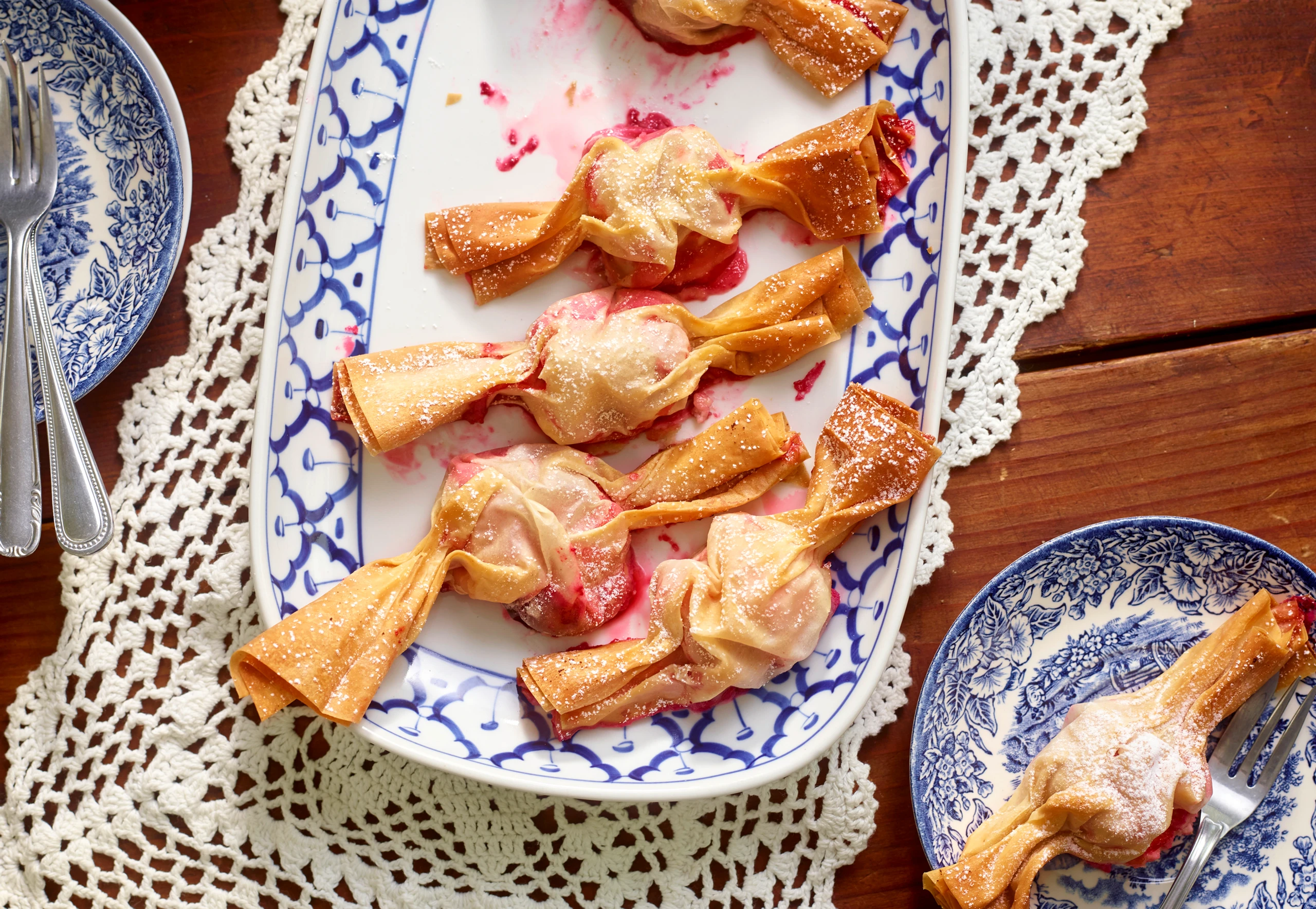 Strudelteigblätter übereinanderlegen und in 8 Rechtecke schneiden. 2 Rechtecke übereinanderlegen und eine Zwetschke darin einrollen. Enden fest zusammendrücken.