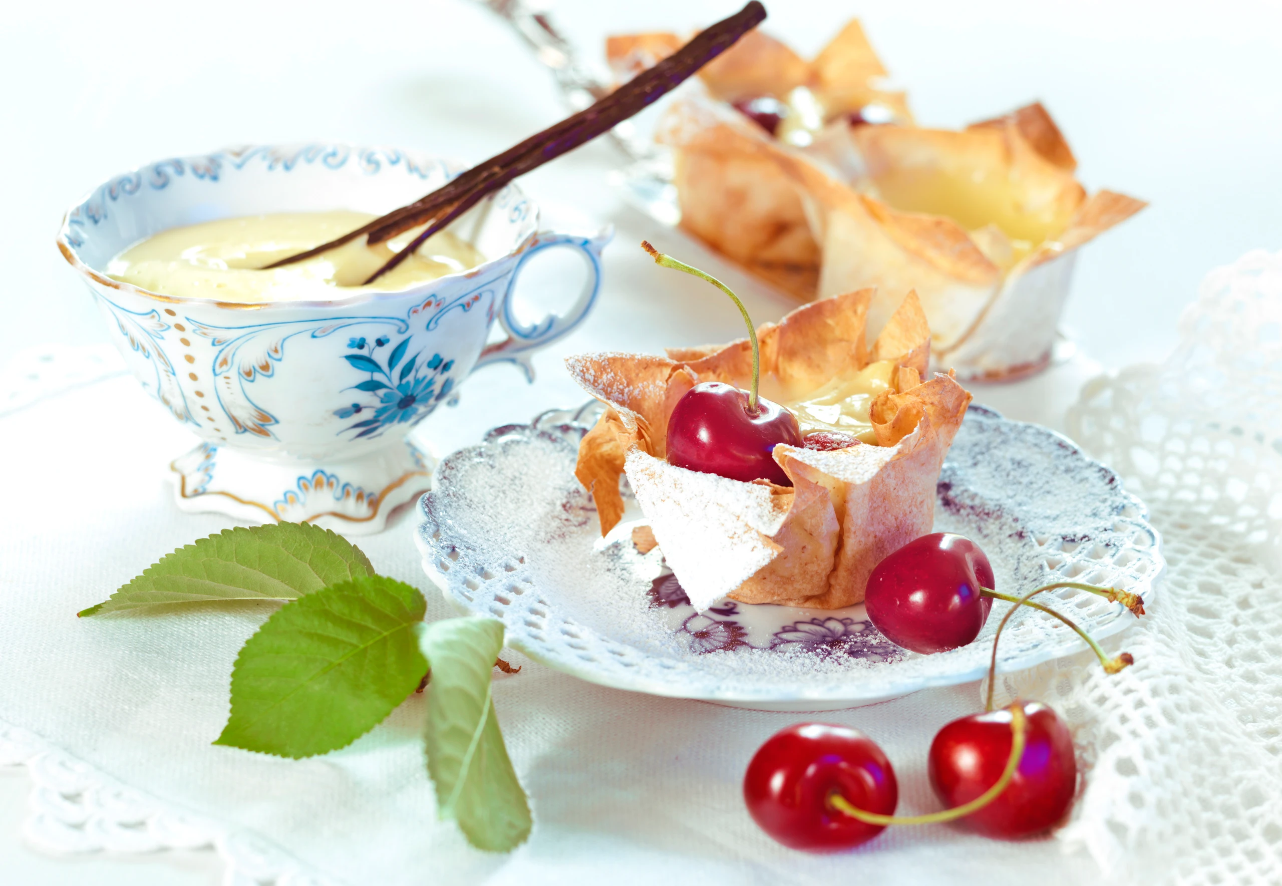 Strudelteigschüsserl mit Vanillecreme und Kirschen