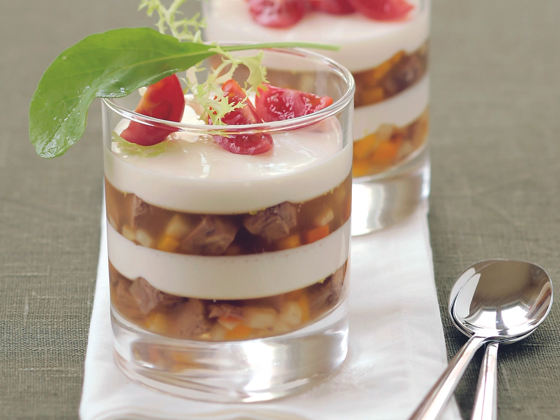 Suppe aufkochen, mit Salz, Muskat und 1 EL Essig würzen. Gelatine in der Suppe auflösen. Gemüse und Fleisch untermischen, die Hälfte davon in Gläser (Inhalt 200 ml) füllen, mit Suppe aufgießen und für 15 Minuten kalt stellen.