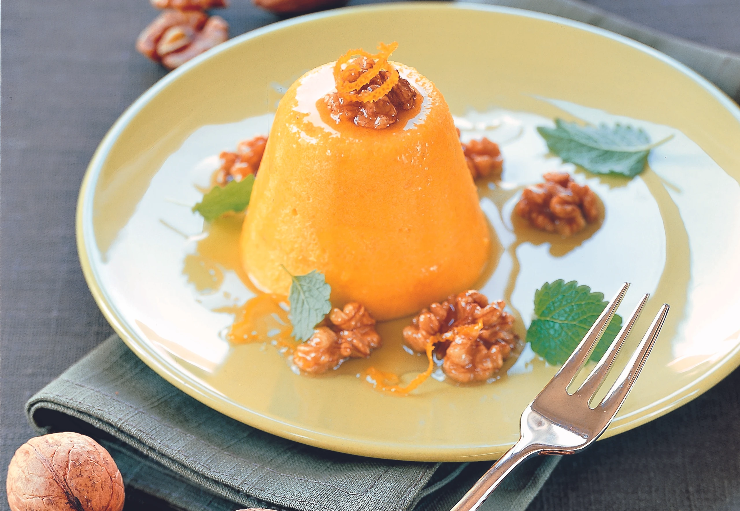 Gelatine in kaltem Wasser einweichen. Kürbis durch das Sieb streichen und mit übrigem Zucker, Orangensaft, Anis und abgeriebener Zitronenschale verrühren. Ausgedrückte Gelatine in der noch warmen Kürbismasse auflösen. Masse auskühlen, aber nicht fest werden lassen.