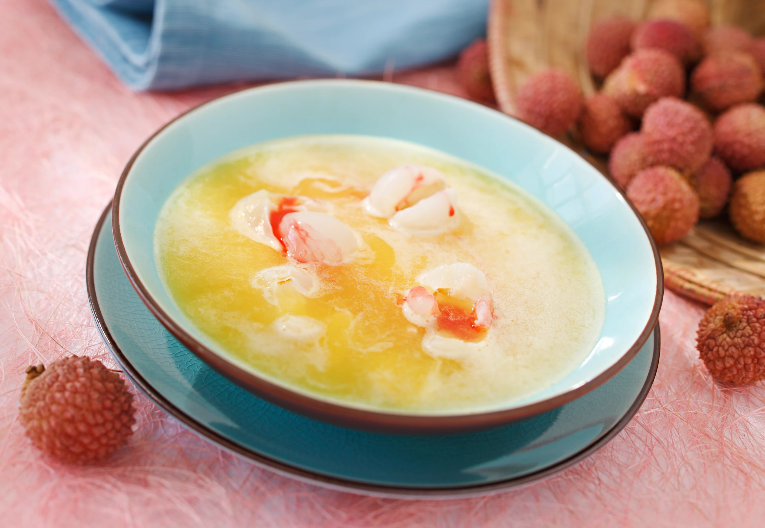 Litschis schälen und halbieren, Kern entfernen. Litschis mit der Ananassuppe vermischen.