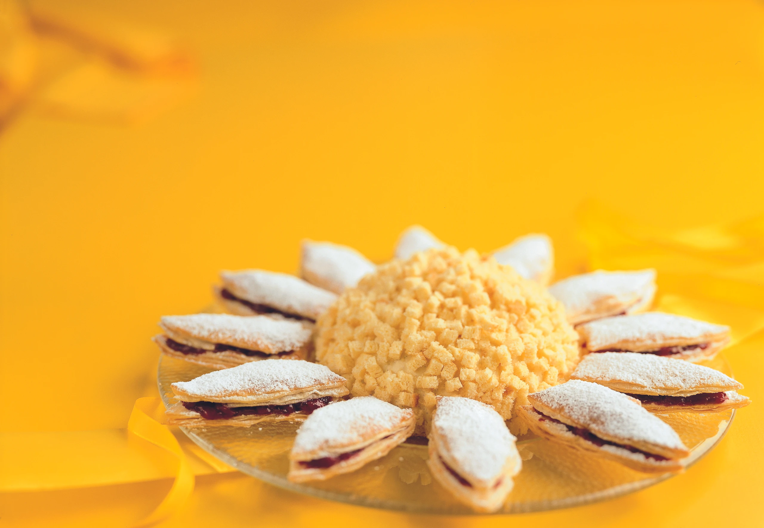 Für die Blütenblätter Backrohr auf 200 °C aufheizen. Backblech mit Backpapier belegen. Blätterteig auf einer bemehlten Arbeitsfläche auflegen. Aus dem Teig mithilfe einer Schablone 12 Blütenblätter ausschneiden, auf das Blech legen und mit Ei bestreichen. Im Rohr (mittlere Schiene) goldbraun backen (ca. 10 Minuten).