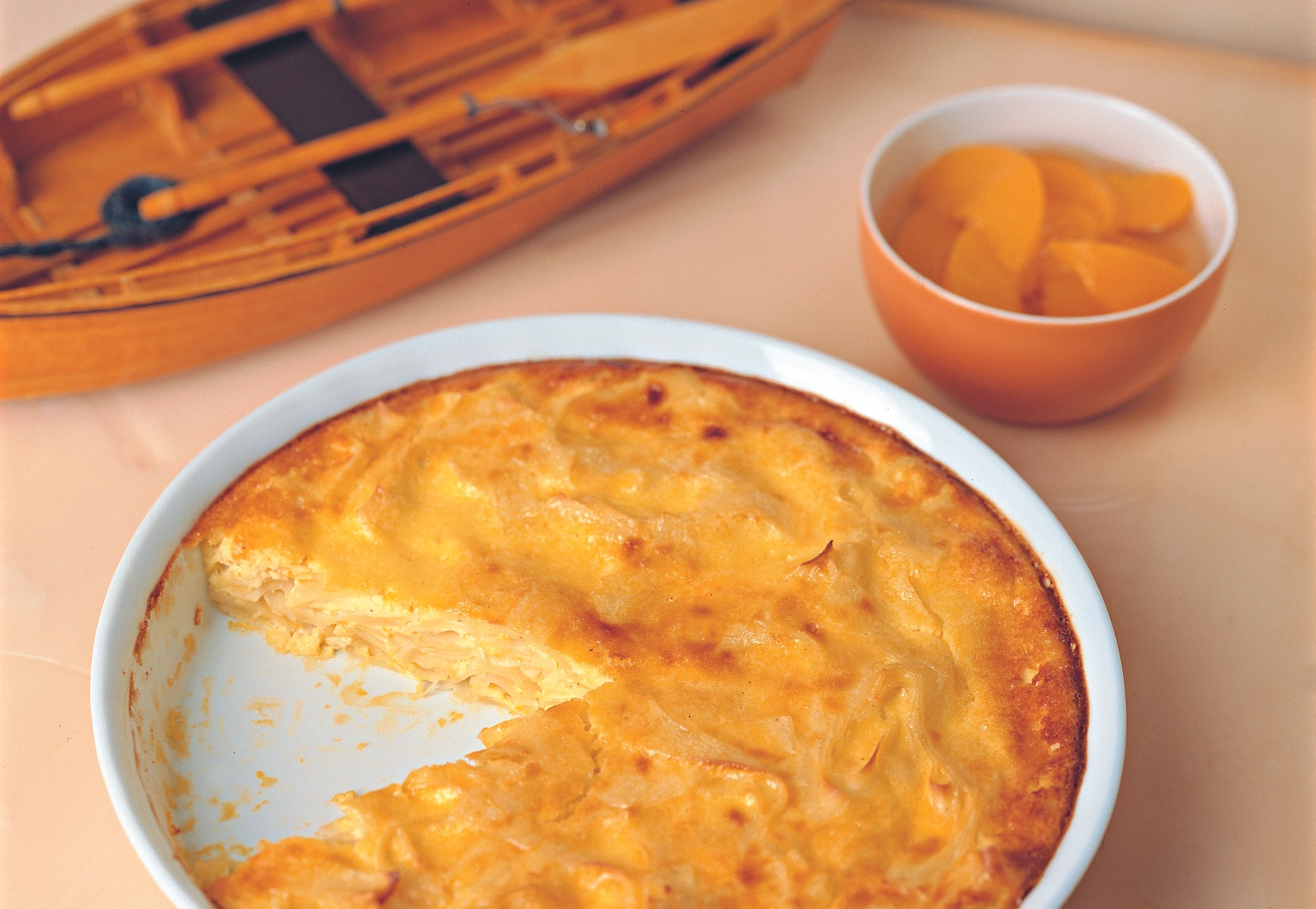 Die Nudeln in der Form verteilen, mit Sauce übergießen und im vorgeheizten Rohr ca. 1/2 Stunde backen. Zum Nudelauflauf passt Pfirsich- oder anderes Fruchtkompott.