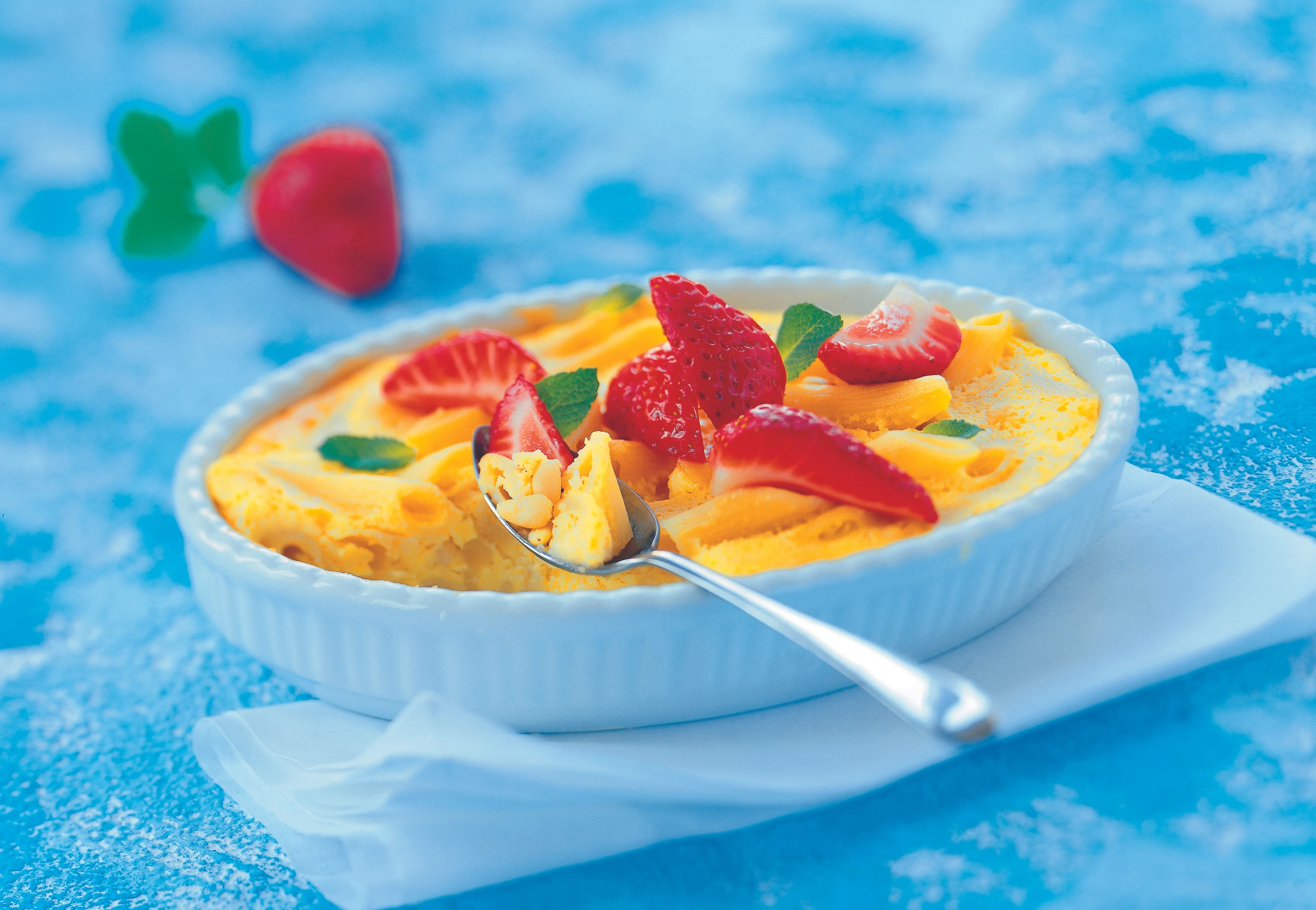 Eine Auflaufform (Inhalt ca. 500 ml) mit Butter ausstreichen und mit Mehl ausstreuen. Backrohr auf 150 °C vorheizen.