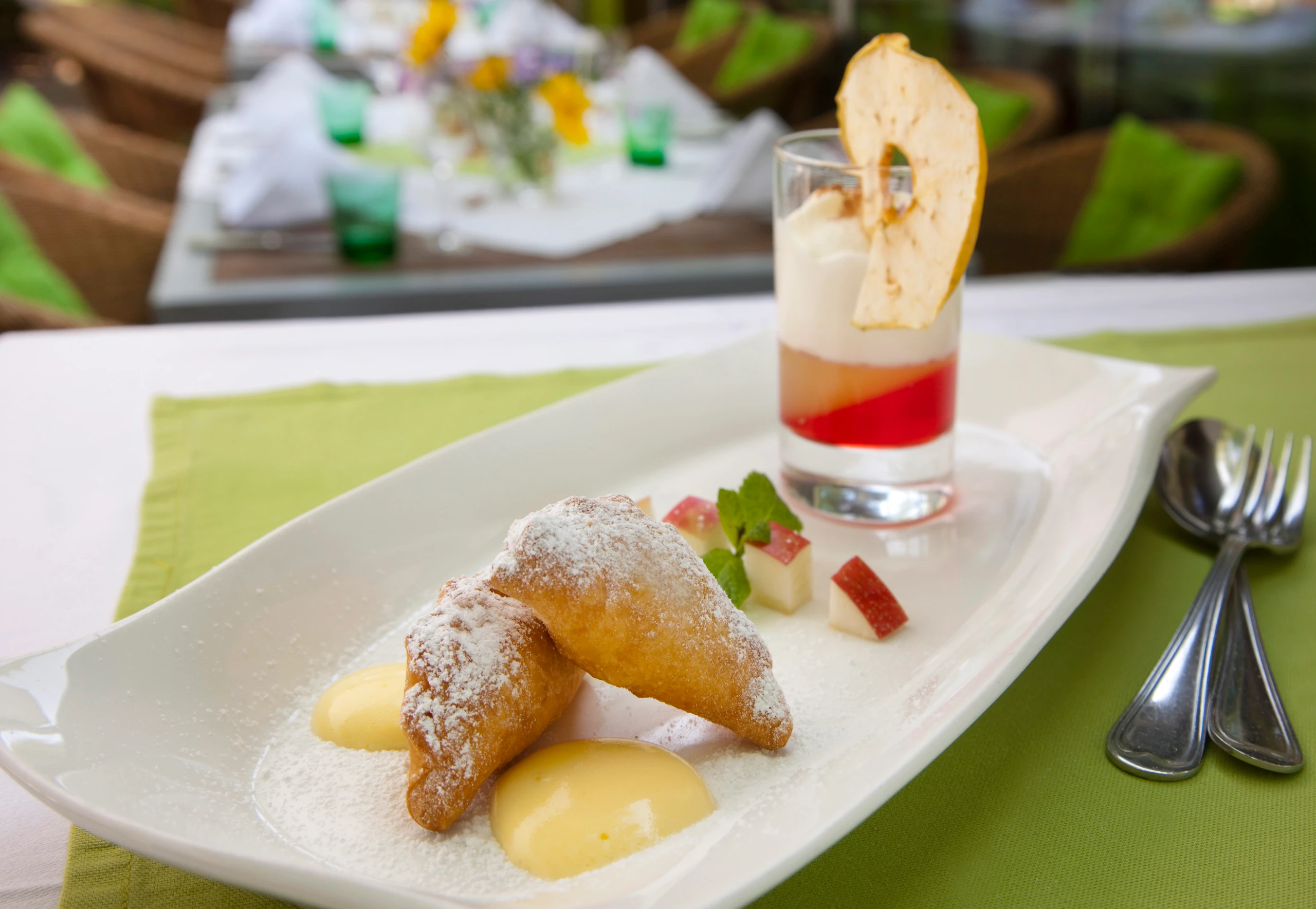 Für den Schaum Sekt, Dotter, Zucker und Apfelbrand über Dampf schaumig aufschlagen. Taschen auf dem Schaum anrichten, mit Zucker bestreuen, mit Mousse und Gelee servieren. Eventuell zusätzlich mit Apfelstücken und Minze garnieren.