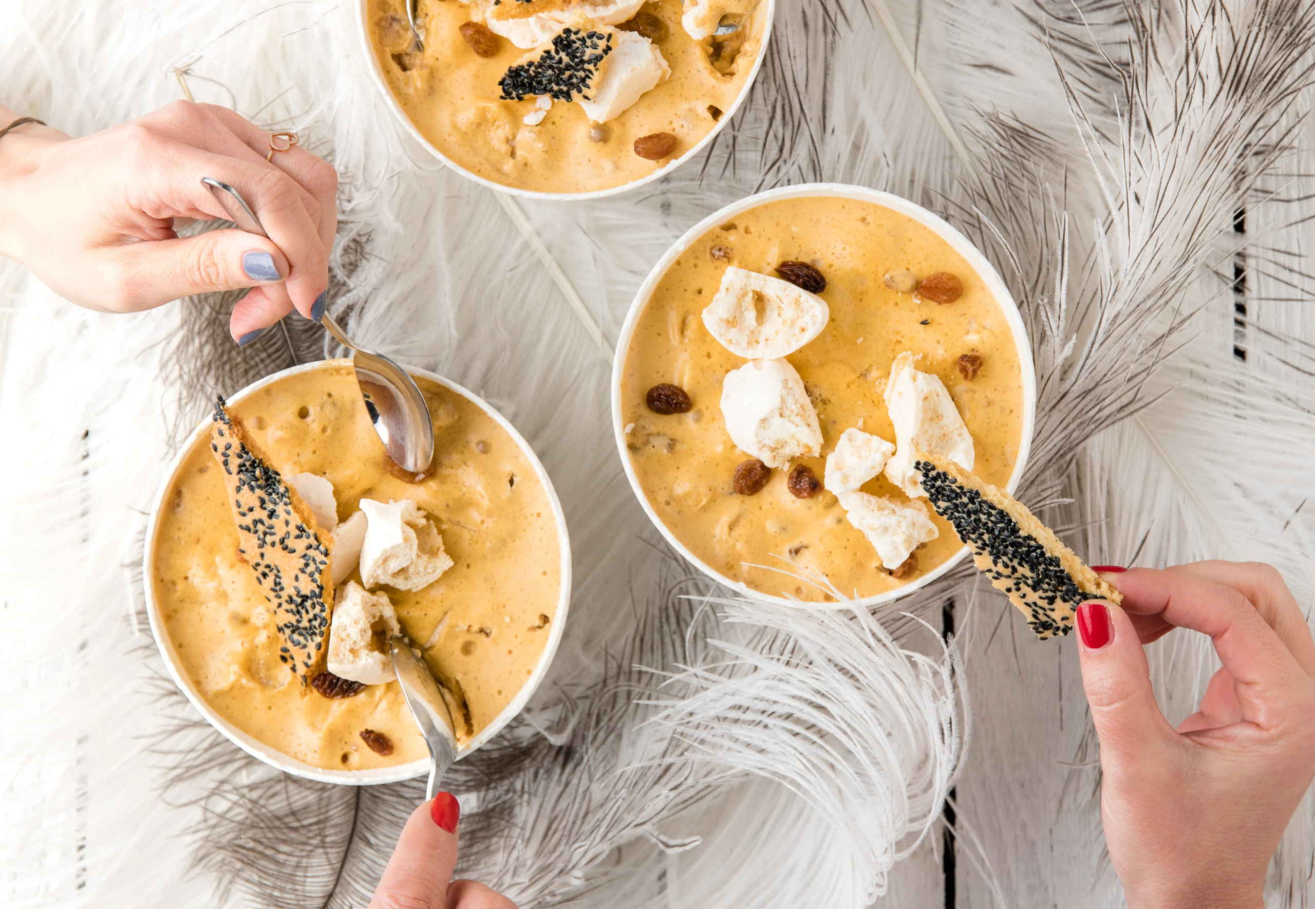 Für die Mousse Gelatine in kaltem Wasser einweichen. Dotter, Rum, Zucker, Vanillezucker, Zimt und Salz verrühren und über Dampf dickcremig aufschlagen. Masse vom Dampf nehmen, Rahm und Rosinen einrühren. Ca. 1 EL Wasser erhitzen, Gelatine ausdrücken und darin auflösen. Mischung in die Dottermasse rühren.
