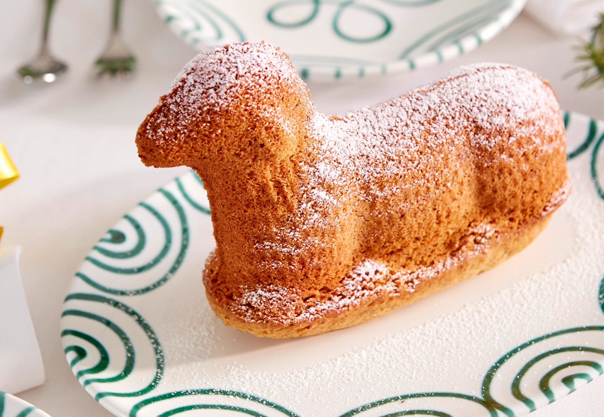Lammkuchen aus der Form lösen und mit Staubzucker bestreuen.