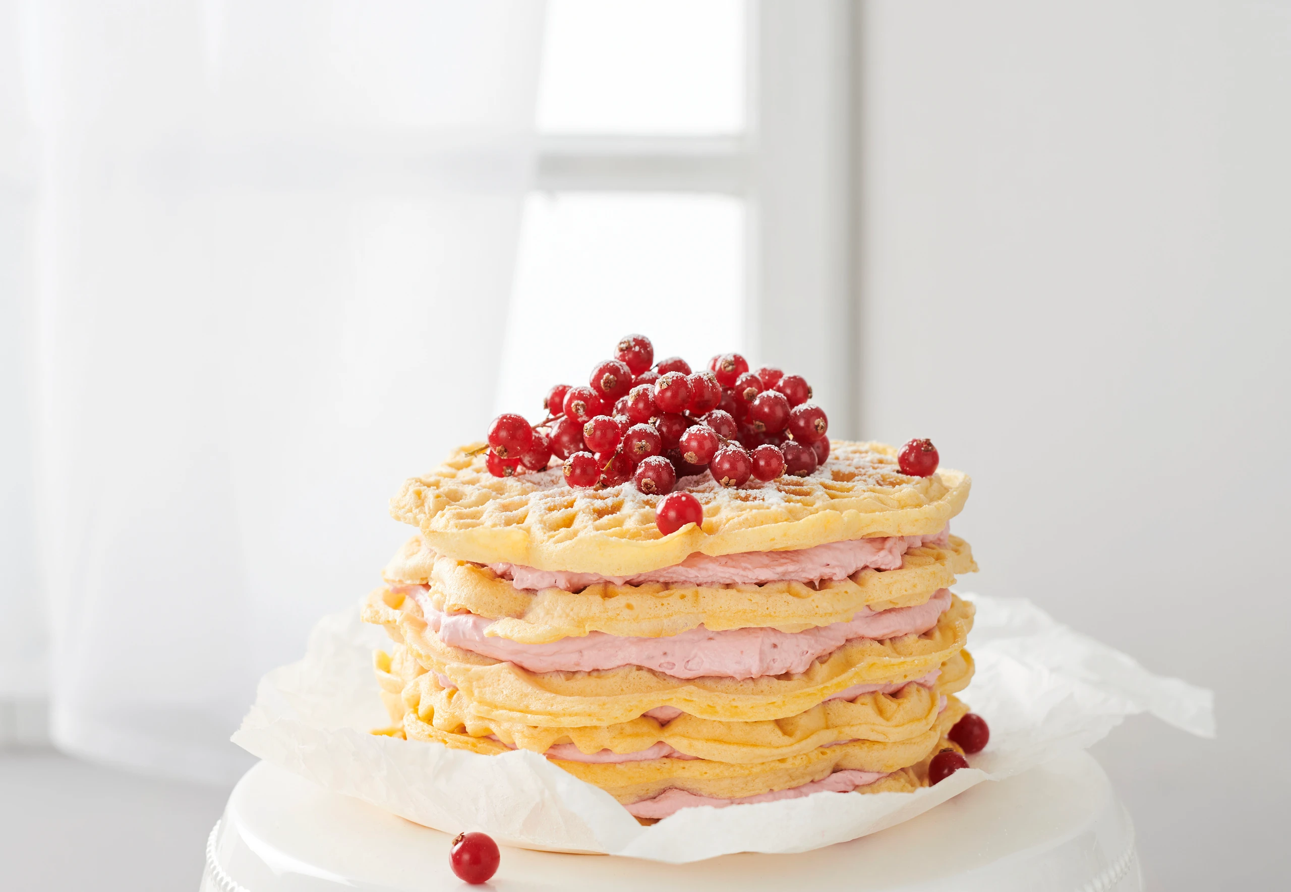 Waffeln abwechselnd mit der Creme übereinanderstapeln. Torte mit Staubzucker bestreuen, mit übrigen Ribiseln verzieren.