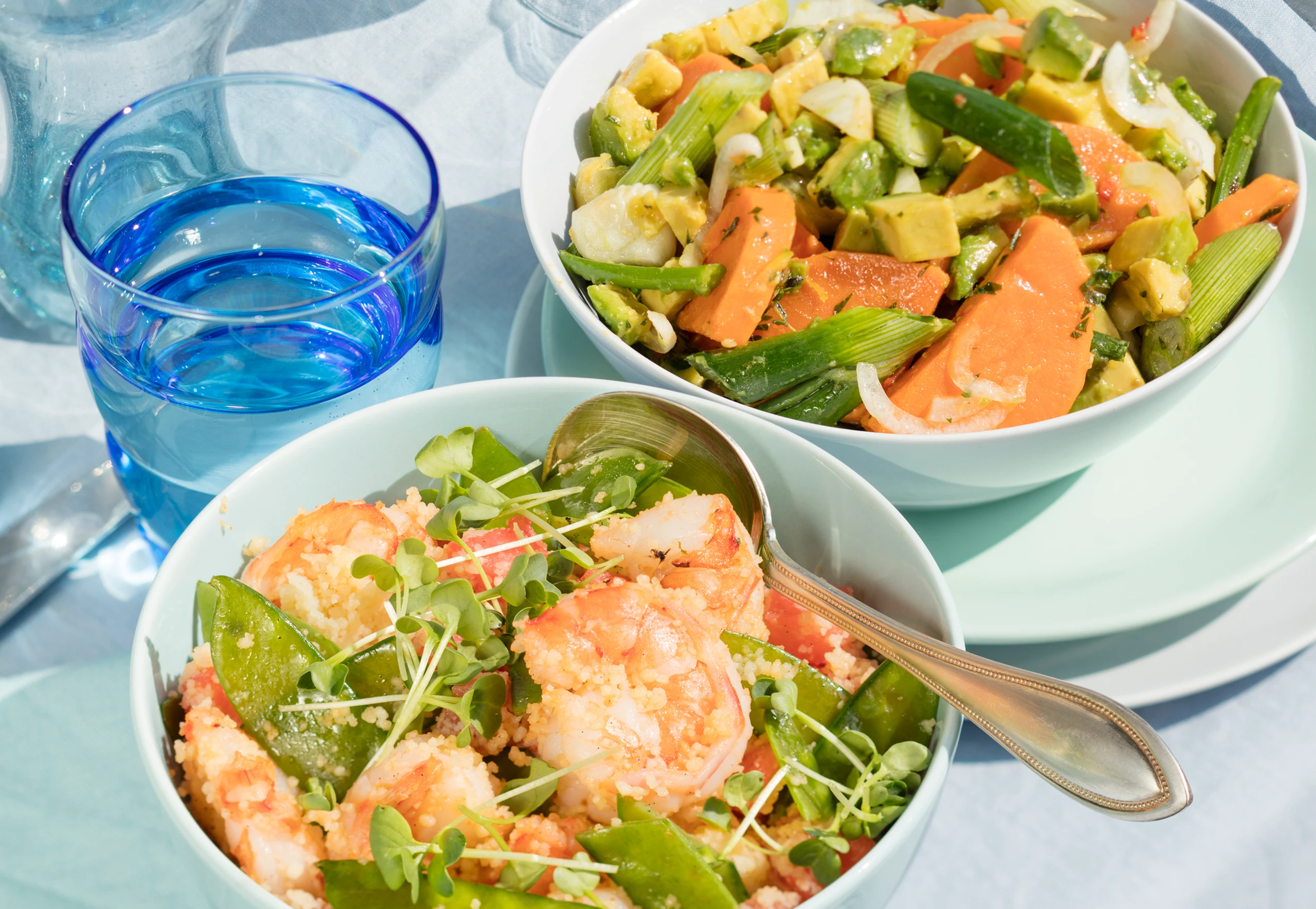 Süßkartoffeln schälen, in ca. 1 cm dicke Scheiben schneiden und in Salzwasser bissfest kochen. Kartoffeln abseihen, kalt abschrecken und trockentupfen. Avocados halbieren, Kern entfernen. Avocados schälen, in ca. 2 cm große Würfel schneiden und mit Zitronensaft vermischen. Jungzwiebeln putzen und quer in ca. 2 cm breite Stücke schneiden.