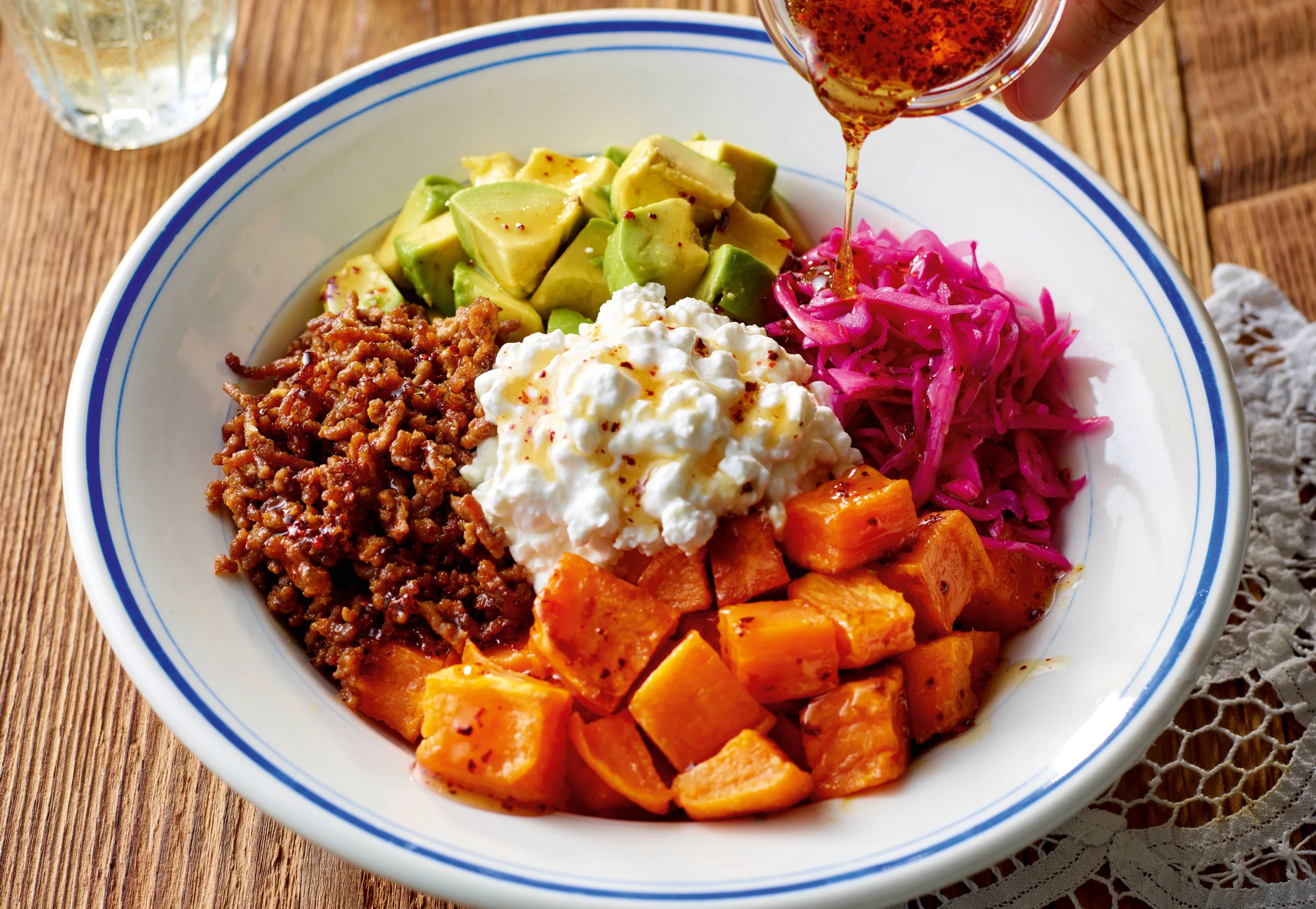 - Süßkartoffeln, Rotkraut, Faschiertes, Avocado und Cottage Cheese auf zwei Bowls aufteilen und mit Hot Honey beträufeln.