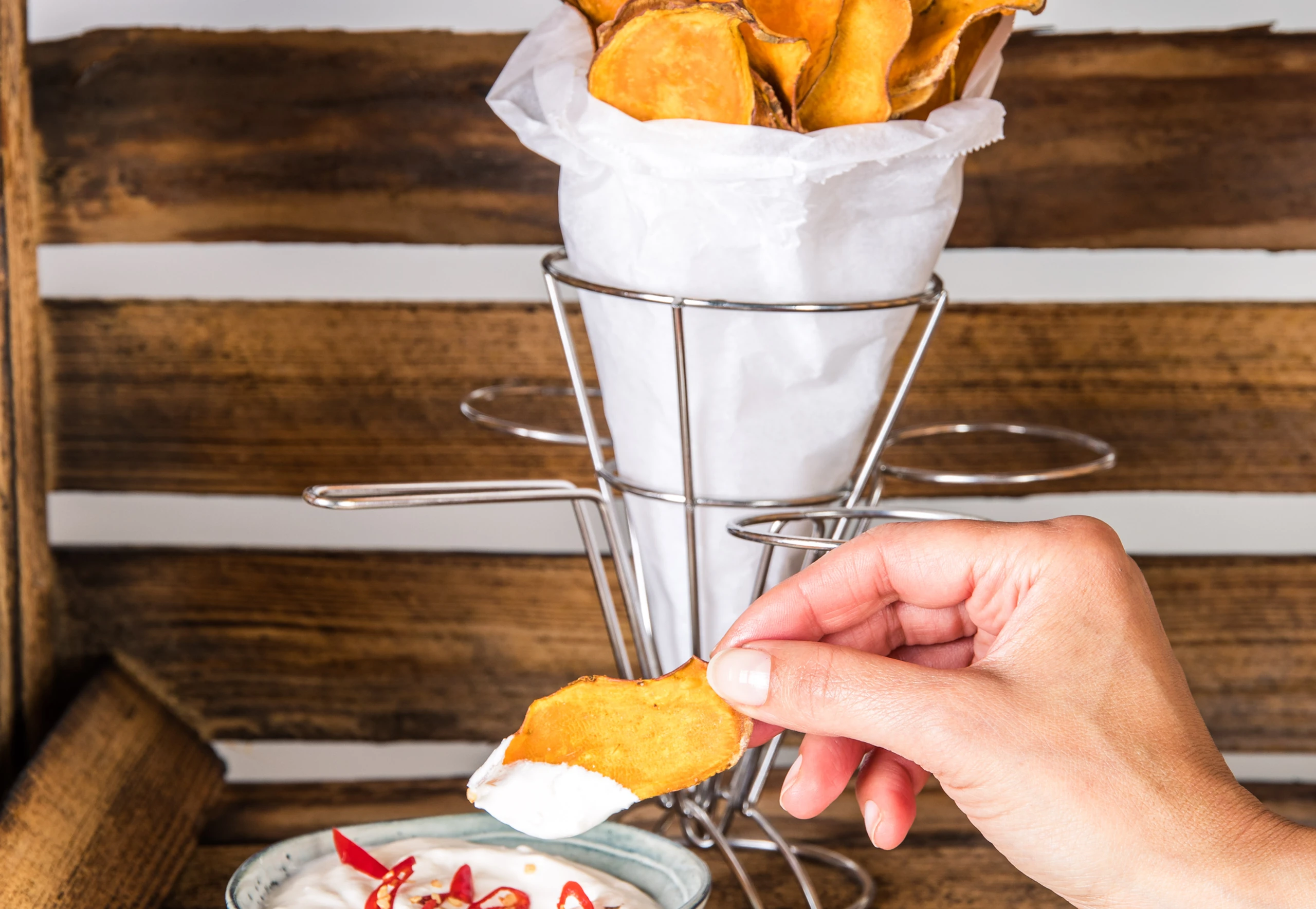 Rohr auf 200°C vorheizen. 2 Backbleche mit Backpapier belegen. Süßkartoffel waschen, in sehr dünne Scheiben schneiden (Hobel, Schneidemaschine oder Mandoline) und auf den Blechen verteilen. Mit Olivenöl bestreichen und mit Salz würzen. Chips hintereinander im Rohr ca. 15 Minuten knusprig backen.