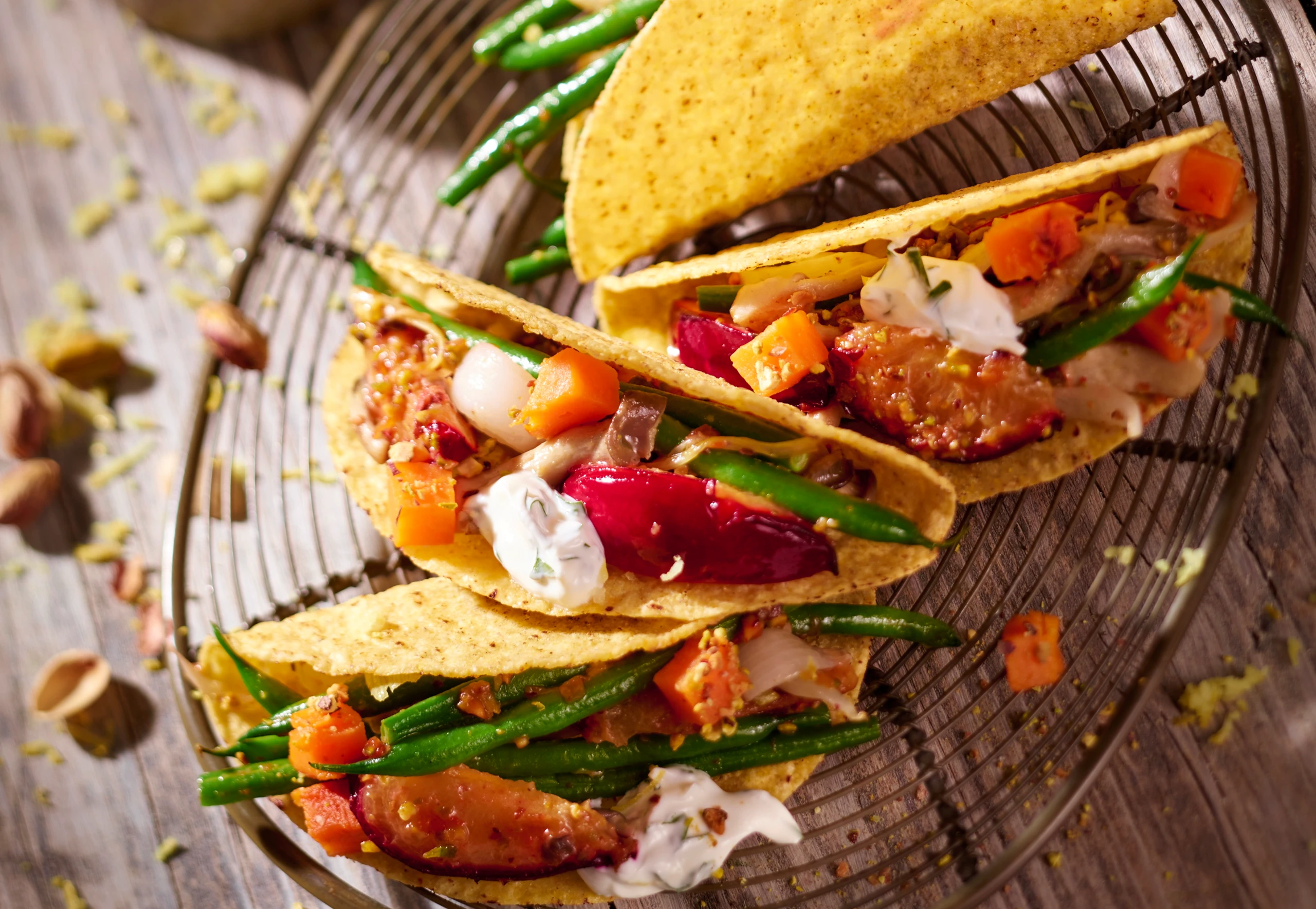 Für das Zitrusjoghurt Joghurt mit Orangen- und Zitronenschale sowie Zitronensaft vermischen, mit Salz und Cayenne abschmecken. Salat in die Taco-Shells füllen, mit Zitrusjoghurt servieren.